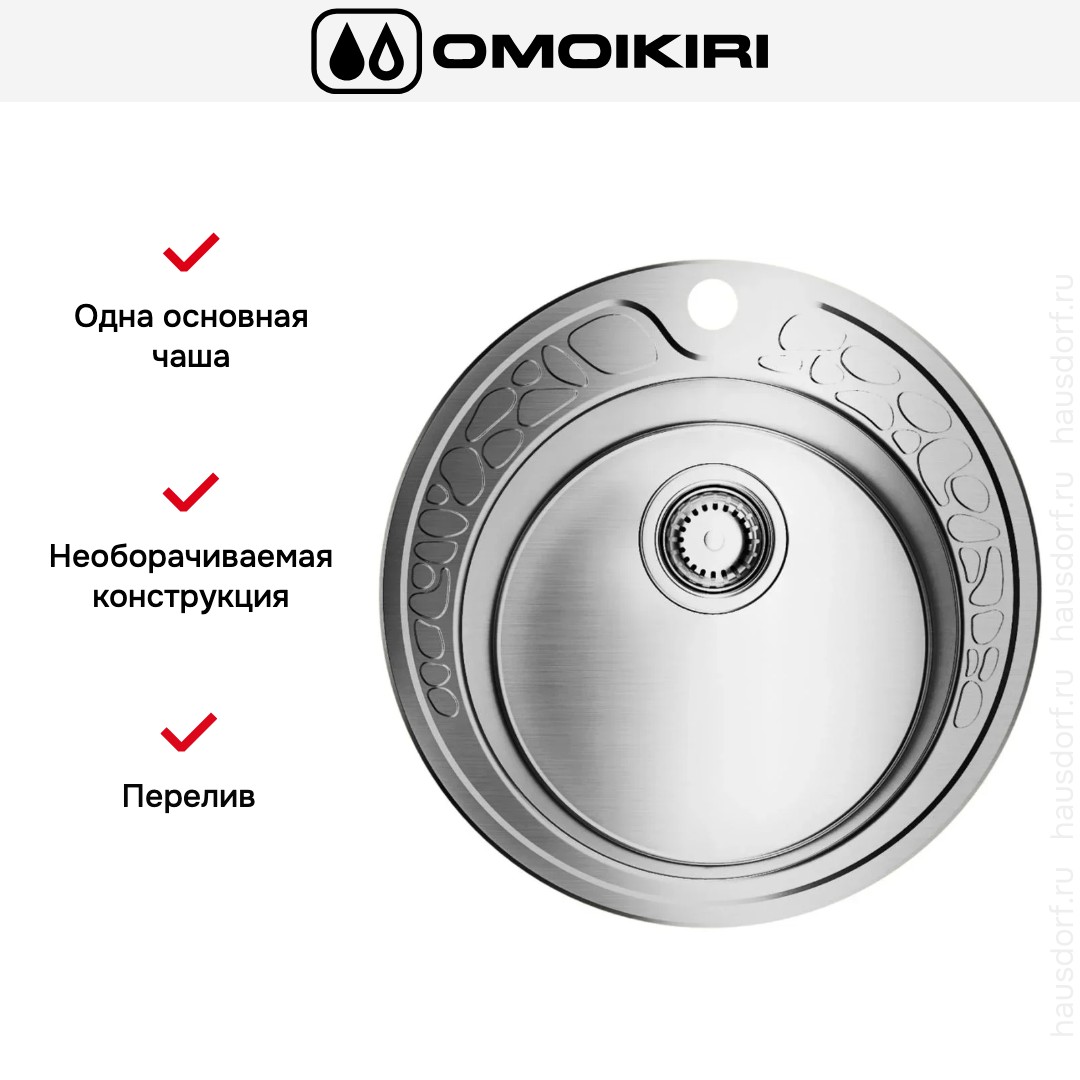 Мойка OMOIKIRI Tovada 49-1 — элегантная врезная круглая модель из нержавеющей стали, которая сочетает компактность и практичность. Изделие выполнено методом цельнотянутой штамповки, что обеспечивает однородную поверхность без сварных швов и эстетичный внешний вид.