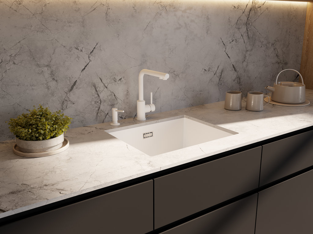 под столешницу — мойка расположена чуть ниже рабочей поверхности для лучшей герметизации;