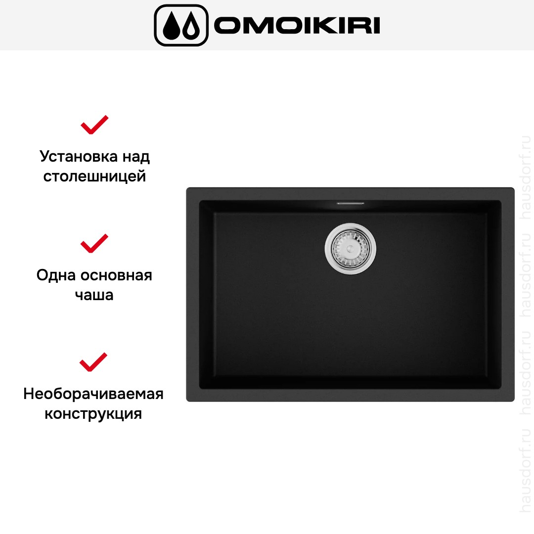 Мойка OMOIKIRI Yamakawa 75T-U-I-BL — врезная прямоугольная модель размером 75,6×45,6 см, разработанная для современных кухонь. Её основная чаша имеет внутренние размеры 70×40 см и глубину 20 см, что обеспечивает вместительность и удобство при мытье крупной посуды. Чёрный цвет придаёт строгий и универсальный вид, легко комбинируется с разными столешницами и фурнитурой. Изготовлена методом литья из материала TetoGranit с толщиной стенки 10 мм. Вес изделия около 13,12 кг, что даёт ощущение солидности и прочности при эксплуатации. Конструкция необорачиваемая, поэтому отверстие под монтаж нужно планировать заранее.