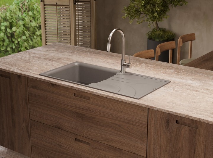 Интегрированная — встраиваемая модель из того же материала, что и столешница. Благодаря этому она выглядит как часть мебели.