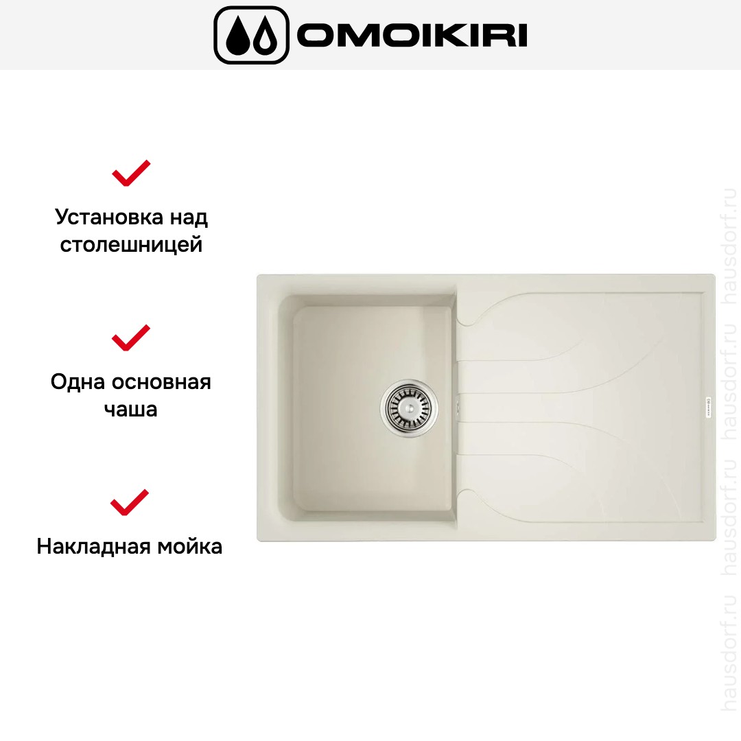 Накладная мойка Omoikiri — отличный выбор для тех, кто хочет создать гармоничное пространство с удобной сантехникой. простой в установке. Преимущество такой конструкции: легко подобрать практически к любой кухне и не придется демонтировать вместе с тумбой при ремонте или перестановке остальной мебели. Данная модель имеет стандартную форму, поэтому подходит большинству пользователей. Устанавливается над столешницей: это самый простой способ монтажа, зачастую с ним можно справиться даже без специалистов, главное — правильно рассчитать размеры ниши.