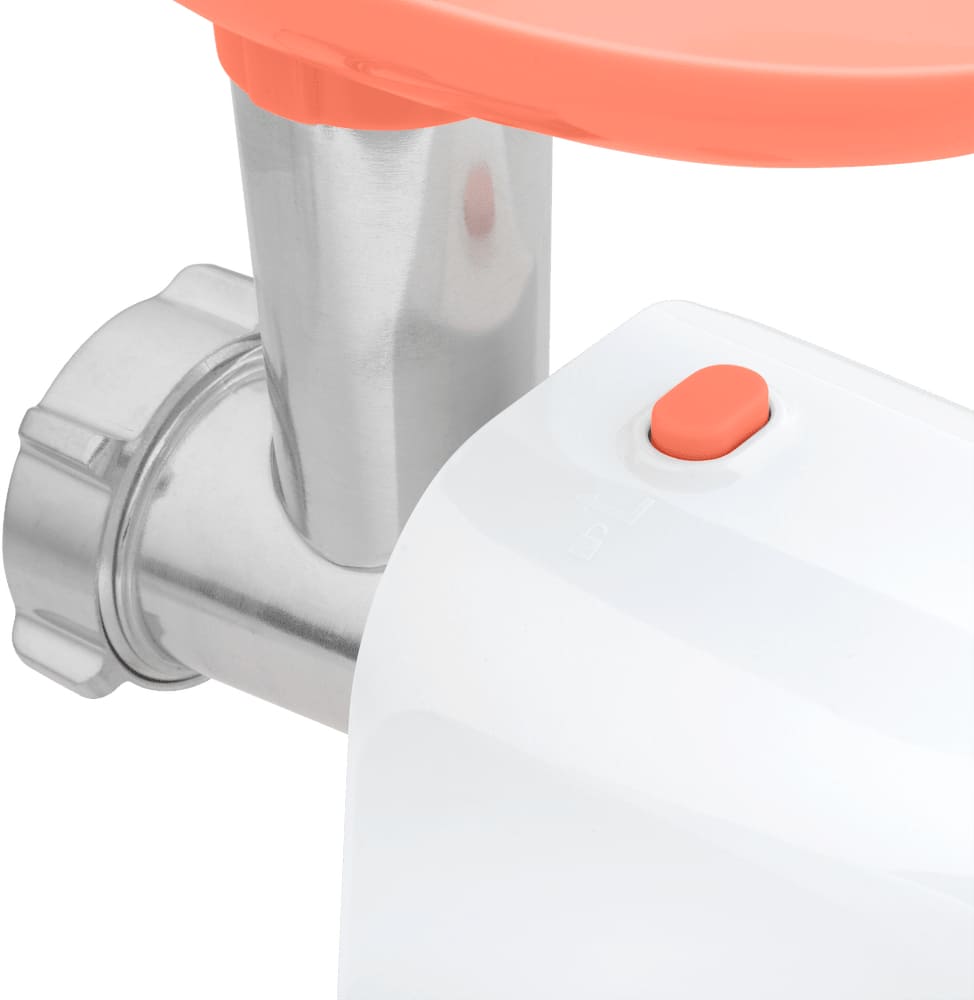 Корпус выполнен из пластика, что обеспечивает небольшой вес и удобство в уходе, а пластиковый загрузочный лоток упрощает загрузку продуктов и не требует сложного обслуживания. Круглая горловина и универсальный толкатель ускоряют подачу мяса к режущему механизму и минимизируют риск забивания. Встроенный отсек для хранения насадок помогает содержать аксессуары в порядке и экономит место на кухне.