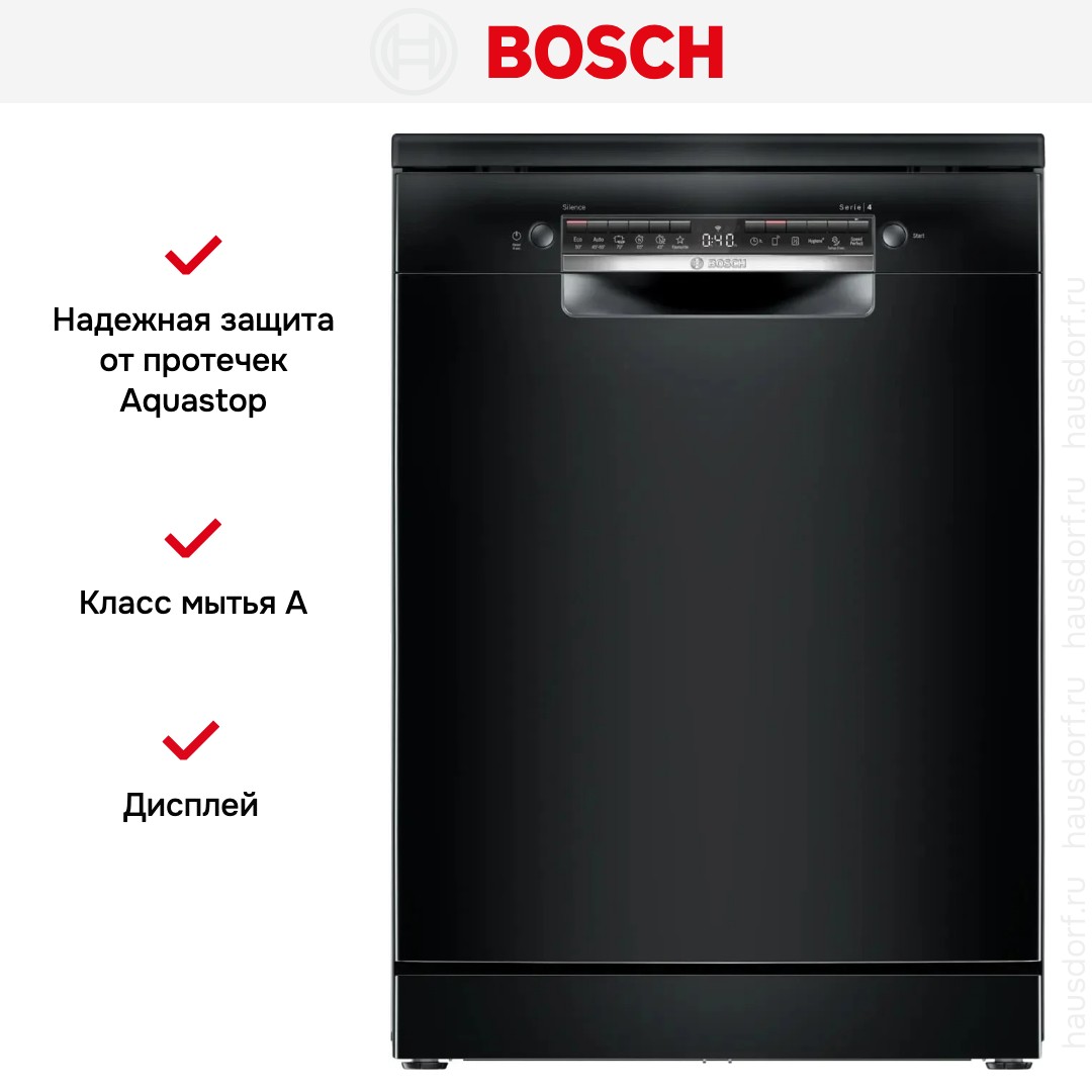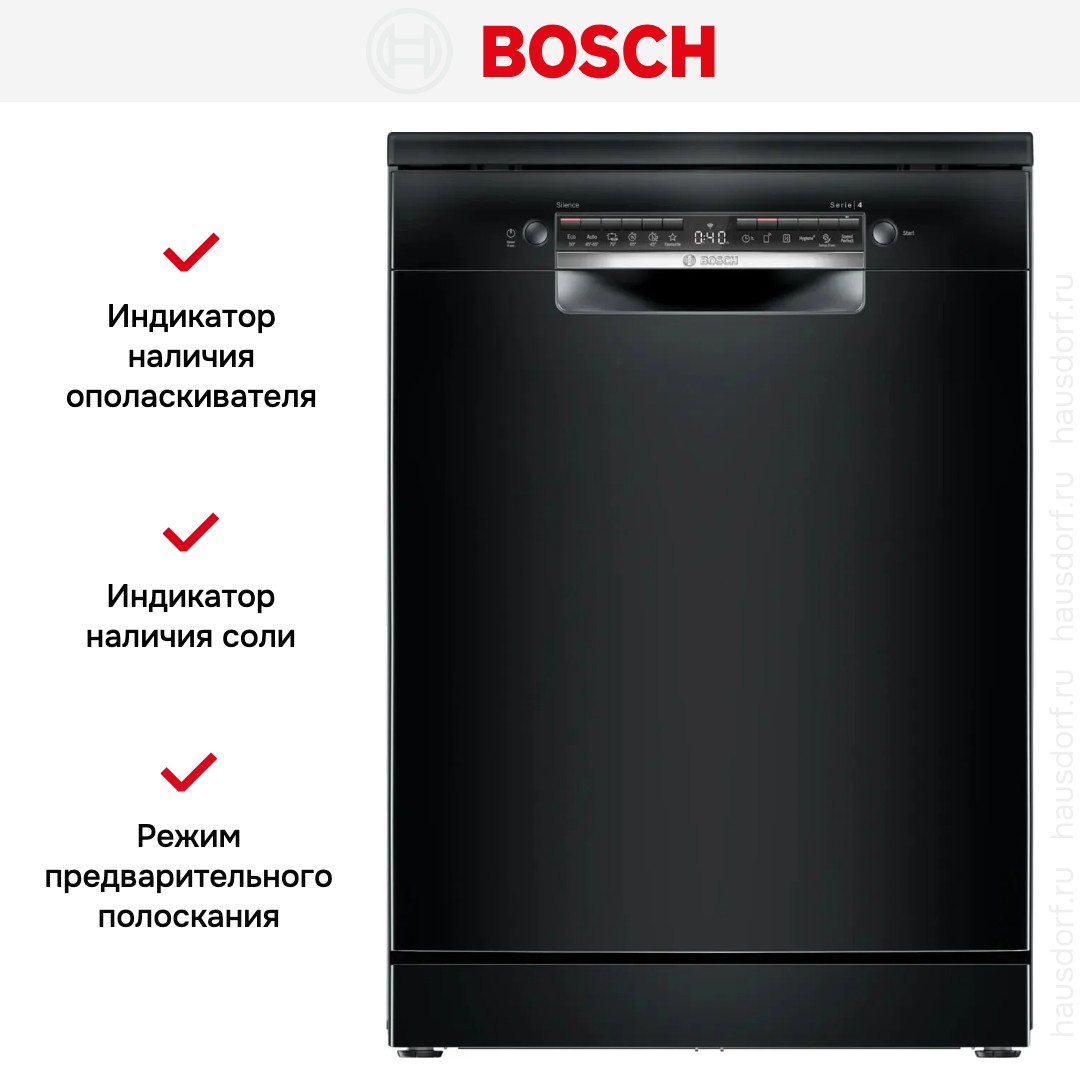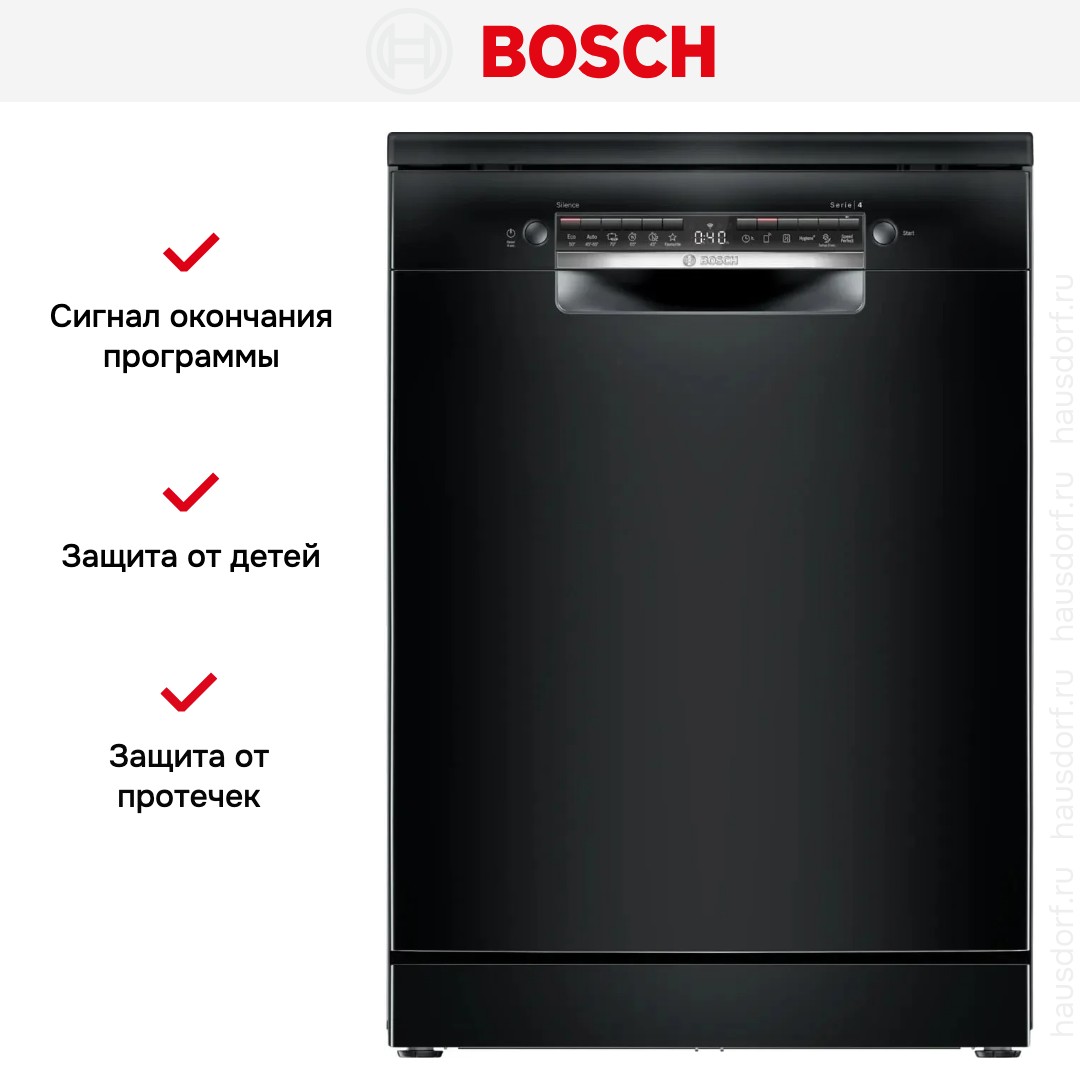 Посудомоечная машина Bosch SMS4IMB62Q выполнена в строгом черном цвете и предназначена для автономной установки. Ее полноразмерный корпус 84.5×60×60 см дает вместимость на 13 комплектов посуды, что делает устройство удачным выбором для семьи из 3-5 человек. Открытая панель управления в тон корпуса и цифровой дисплей создают лаконичный функциональный дизайн, а черная отделка панели снижает видимость отпечатков и следов воды.