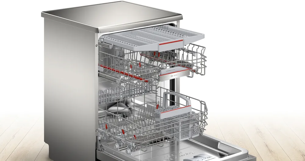Отдельностоящая модель Бош отлично впишется в кухонный интерьер, главное — правильно выбрать место, чтобы подвести коммуникации. Имеет стандартные размеры, поэтому может не поместиться на очень маленькой кухне. В камеру можно загрузить ограниченное число комплектов: 14 шт. Комплектом считается набор посуды на одного человека, который нужен для полноценного приема пищи: глубокая и плоская тарелки, тарелка для салата, блюдце под чашку, сама чашка, ложка и вилка.