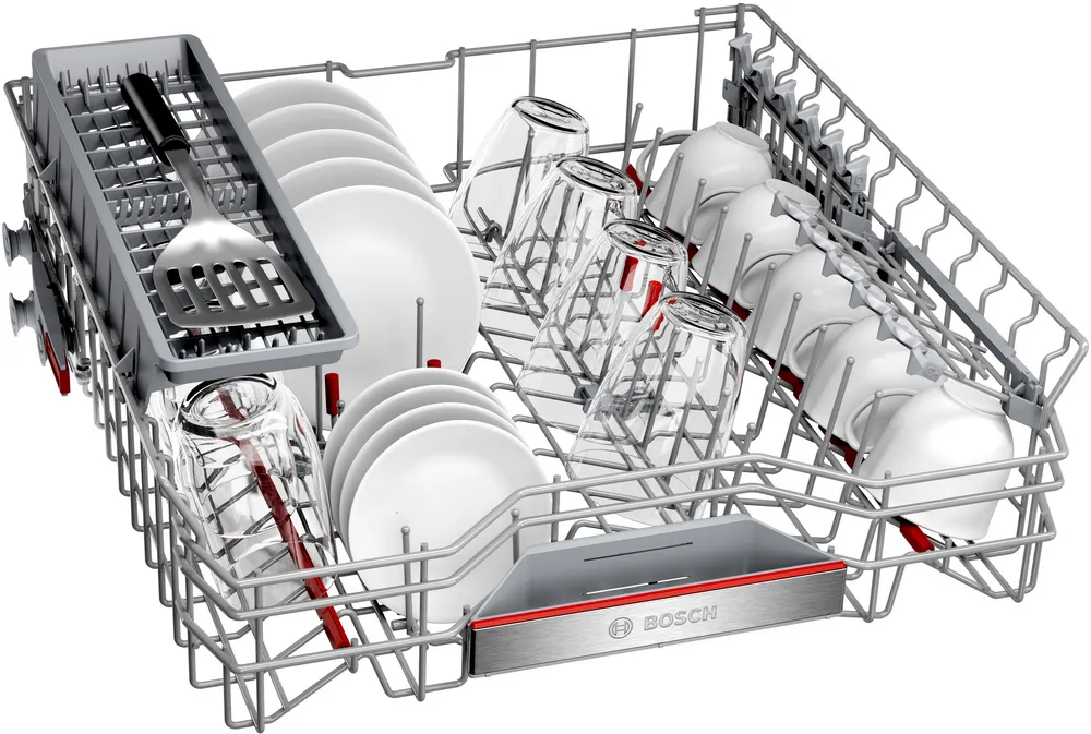 Верхняя корзина может регулироваться по высоте, так что при необходимости в нее можно поместить тарелки большего размера. Нижняя корзина позволяет установить вертикально большие суповые тарелки и блюда большого диаметра — для этого верхнюю корзину можно поднять выше. Тарелки обычно устанавливаются в откидные рамки-держатели, которые легко складываются на дно корзины. Всю посуду в нижней корзине рекомендуется устанавливать без соприкосновения предметов друг с другом, углублением к центру для более интенсивного воздействия струй воды на внутреннюю часть посуды.