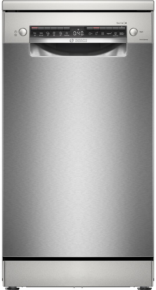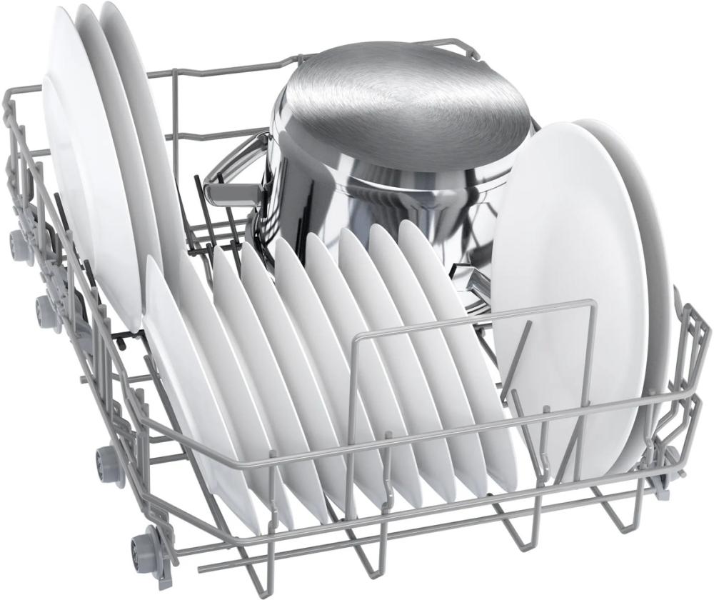 Отдельностоящая модель Бош отлично впишется в кухонный интерьер, главное — правильно выбрать место, чтобы подвести коммуникации. Имеет уменьшенную ширину — благодаря этому поместится даже на очень маленькой кухне. В камеру можно загрузить ограниченное число комплектов: 10 шт. Комплектом считается набор посуды на одного человека, который нужен для полноценного приема пищи: глубокая и плоская тарелки, тарелка для салата, блюдце под чашку, сама чашка, ложка и вилка.