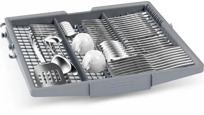 Встраиваемая модель Бош отлично впишется в любой интерьер, главное — правильно выбрать место, чтобы подвести коммуникации. Устанавливается в нишу целиком, полностью закрывается декоративной панелью. Обратите внимание: в комплекте не идет фасад, его необходимо установить самостоятельно. Имеет стандартные размеры, поэтому может не поместиться на очень маленькой кухне. В камеру можно загрузить ограниченное число комплектов: 14 шт. Комплектом считается набор посуды на одного человека, который нужен для полноценного приема пищи: глубокая и плоская тарелки, тарелка для салата, блюдце под чашку, сама чашка, ложка и вилка.