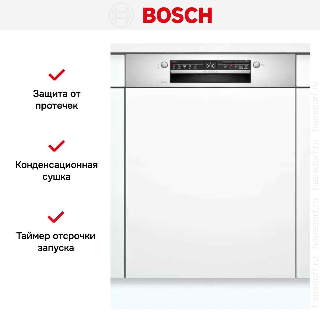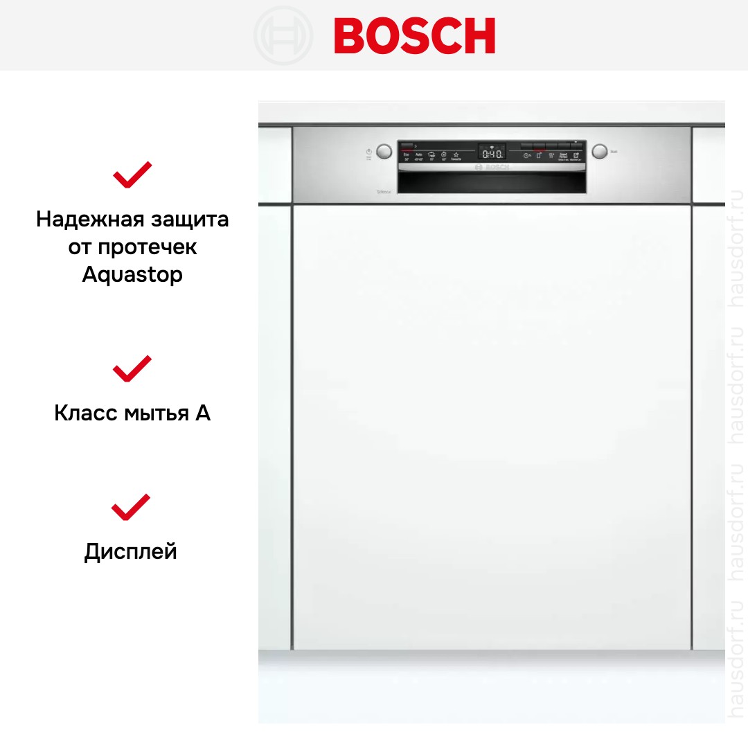 Посудомоечная машина Bosch SMI2ITS33E представляет собой встраиваемое полноразмерное решение для тех, кто ценит аккуратный и единый облик кухни. Она полностью прячется за фасадом, а панель из нержавеющей стали остаётся доступной для управления и смотрится стильно. Габариты 81.5×59.8×57.3 см и рекомендуемый проём 81.5—87.5×60×55 см позволяют установить прибор в стандартный кухонный модуль. Отсутствие выступающих элементов сохраняет лаконичность интерьера и освобождает рабочее пространство.