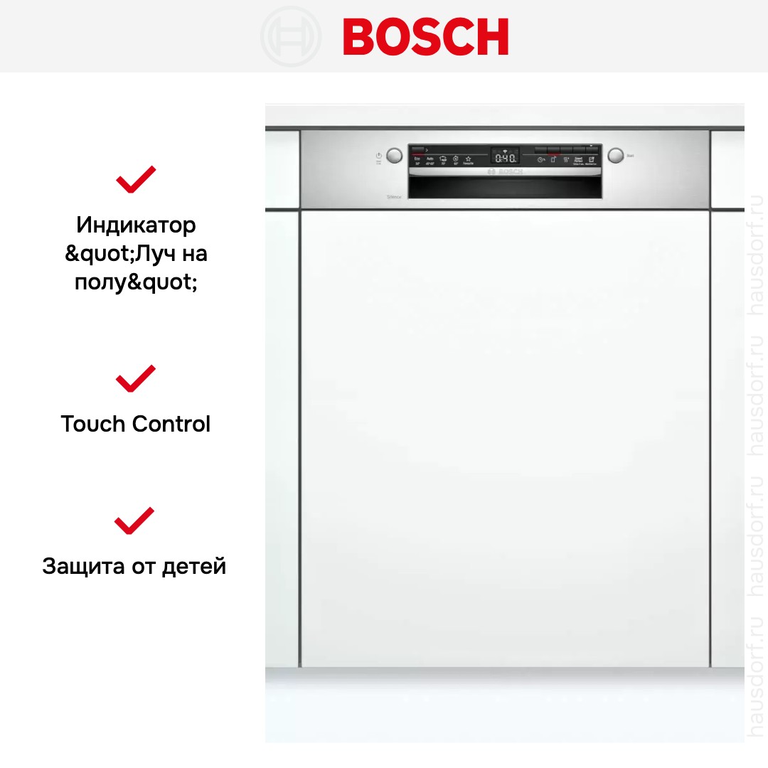 Управление реализовано через открытую сенсорную панель с цифровым дисплеем, что делает выбор режимов простым и быстрым. Наличие Touch Control и электронного интерфейса обеспечивает точность настроек и интуитивную навигацию. Индикатор «Луч на полу» и InfoLight подсказывают статус работы, не требуя открывания дверцы. Таймер отложенного старта от 1 до 24 часов и интеграция Home Connect дают гибкость запуска из смартфона и позволяют планировать мойку под тарифы или личный график.