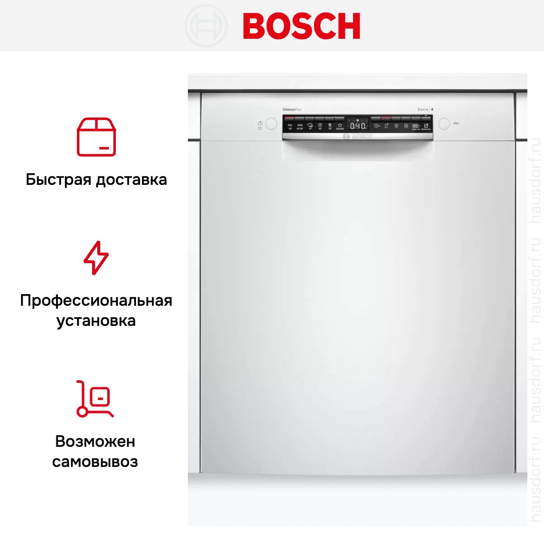 Посудомоечная машина Bosch SMU4HAW48S представляет собой встраиваемое полноразмерное решение с открытой панелью управления, выполненное в белом цвете корпуса и с контрастной чёрной панелью управления. Такое сочетание оттенков впишется в современную кухню и оставит место для дизайна фронтальной дверцы по вашему вкусу. Компактные внешние габариты и диапазон регулировки по высоте позволяют легко подогнать прибор под большинство ниш, а аккуратная открытая панель делает управление интуитивным и удобным.