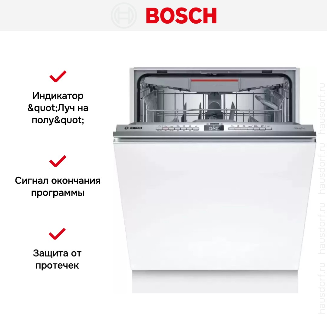 Посудомоечная машина Bosch SMV4EVX01E — встраиваемая полноразмерная модель, созданная для тех, кто ценит чистоту посуды и аккуратный интегрированный интерьер. Она полностью прячется под фасадом мебели, а видимая часть панели выполнена в серебристом тоне. Габариты 81.5×59.8×55 см и диапазон ниши 81.5—87.5×60—60.8×55 см позволяют установить прибор в любой стандартной кухонной структуре.
