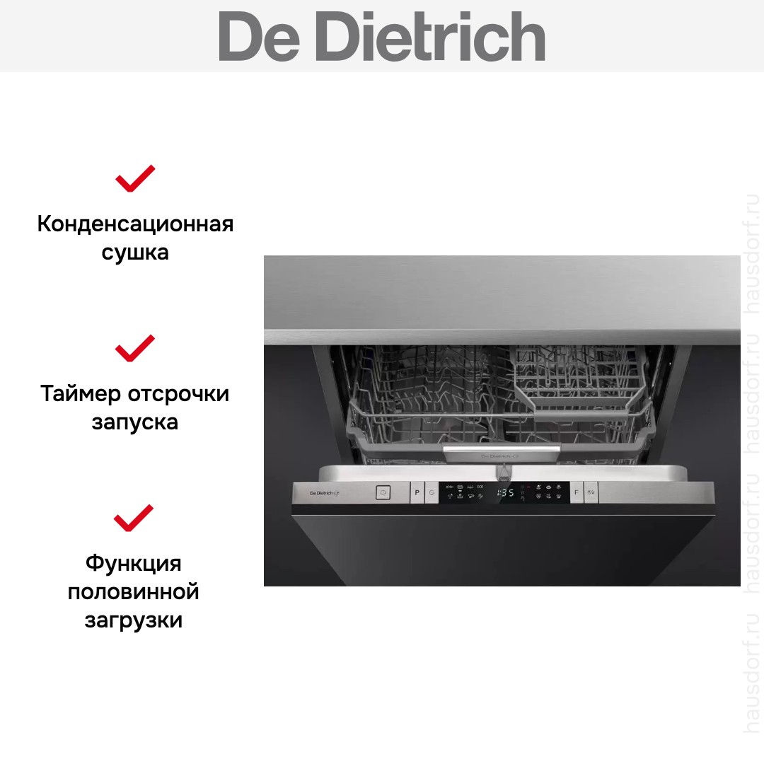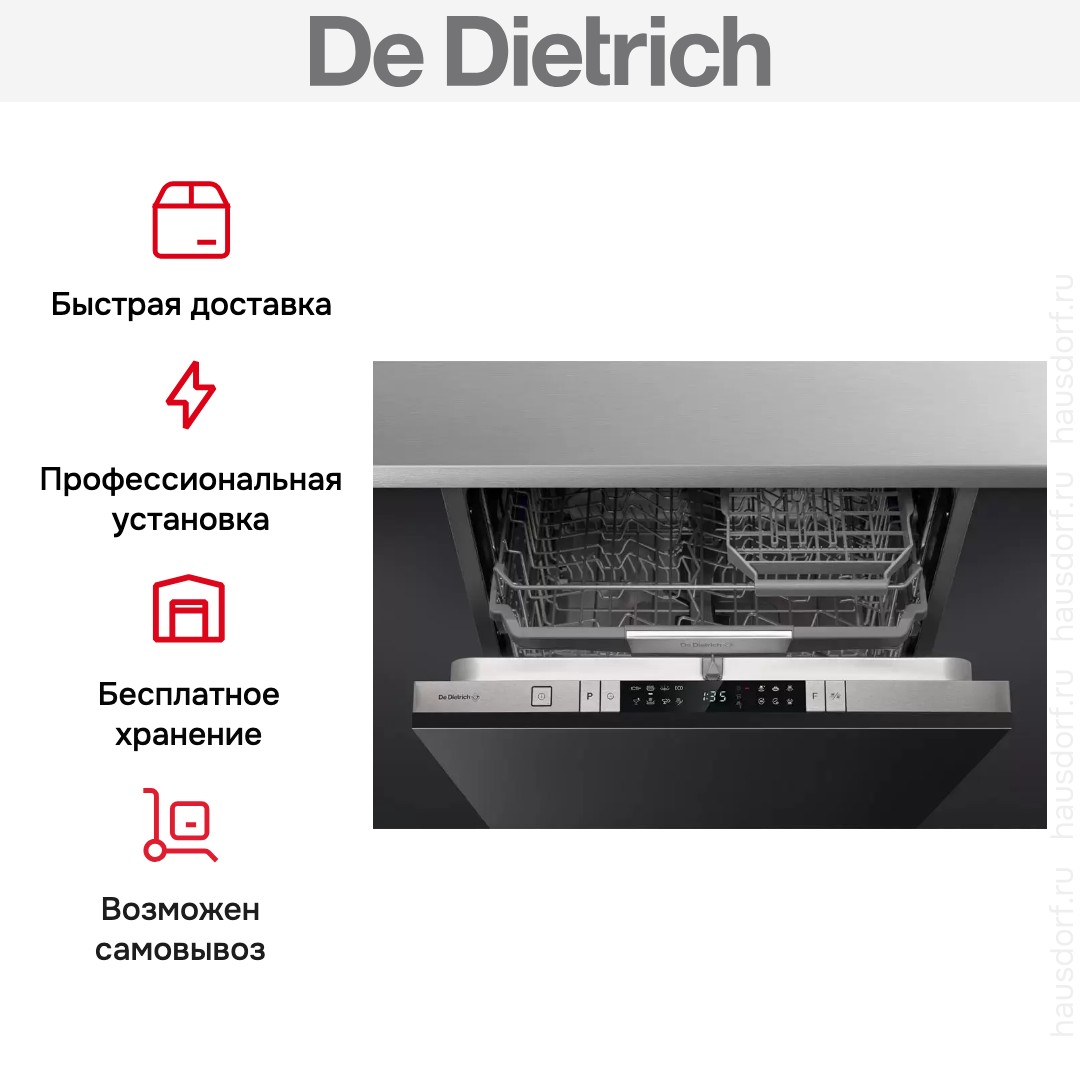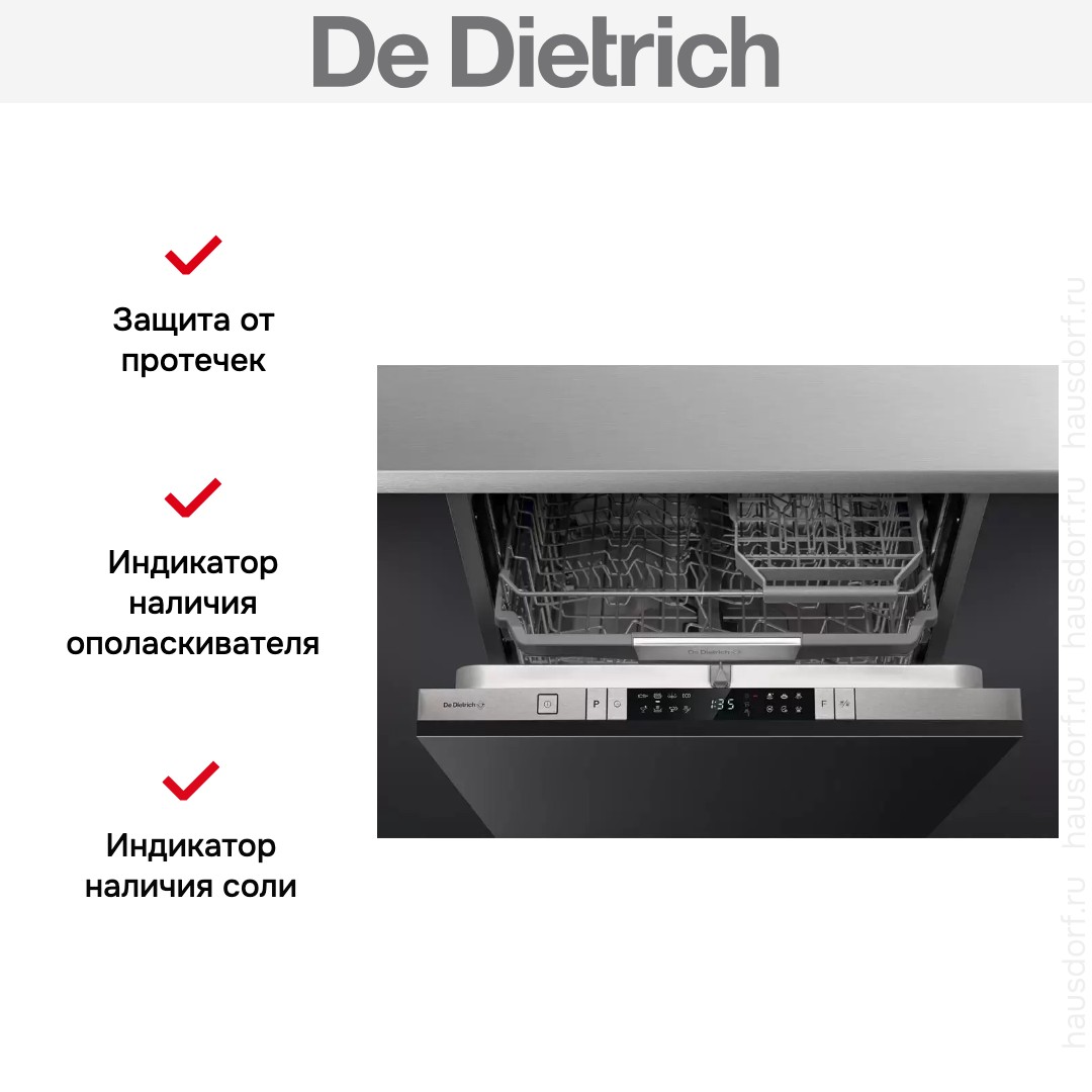 Встраиваемая модель Де Дитрих отлично впишется в любой интерьер, главное — правильно выбрать место, чтобы подвести коммуникации. Устанавливается в нишу целиком, полностью закрывается декоративной панелью. Обратите внимание: в комплекте не идет фасад, его необходимо установить самостоятельно. Имеет стандартные размеры, поэтому может не поместиться на очень маленькой кухне. В камеру можно загрузить ограниченное число комплектов: 14 шт. Комплектом считается набор посуды на одного человека, который нужен для полноценного приема пищи: глубокая и плоская тарелки, тарелка для салата, блюдце под чашку, сама чашка, ложка и вилка.