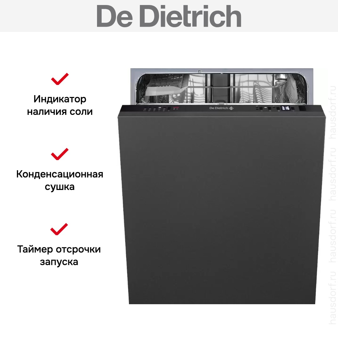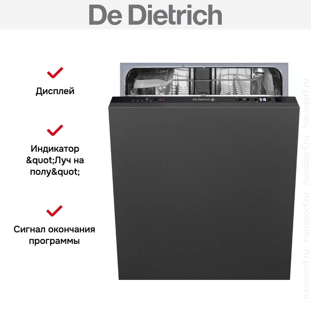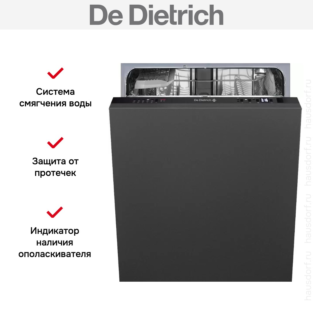 Встраиваемая модель Де Дитрих отлично впишется в любой интерьер, главное — правильно выбрать место, чтобы подвести коммуникации. Устанавливается в нишу целиком, полностью закрывается декоративной панелью. Обратите внимание: в комплекте не идет фасад, его необходимо установить самостоятельно. Имеет уменьшенную ширину — благодаря этому поместится даже на очень маленькой кухне. В камеру можно загрузить ограниченное число комплектов: 10 шт. Комплектом считается набор посуды на одного человека, который нужен для полноценного приема пищи: глубокая и плоская тарелки, тарелка для салата, блюдце под чашку, сама чашка, ложка и вилка.