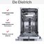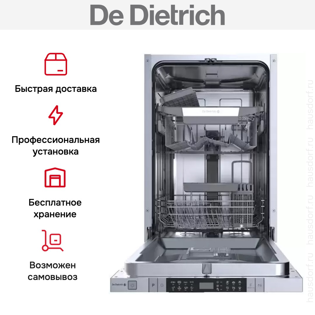 Встраиваемая модель Де Дитрих отлично впишется в любой интерьер, главное — правильно выбрать место, чтобы подвести коммуникации. Устанавливается в нишу целиком, полностью закрывается декоративной панелью. Обратите внимание: в комплекте не идет фасад, его необходимо установить самостоятельно. Имеет уменьшенную ширину — благодаря этому поместится даже на очень маленькой кухне. В камеру можно загрузить ограниченное число комплектов: 10 шт. Комплектом считается набор посуды на одного человека, который нужен для полноценного приема пищи: глубокая и плоская тарелки, тарелка для салата, блюдце под чашку, сама чашка, ложка и вилка.