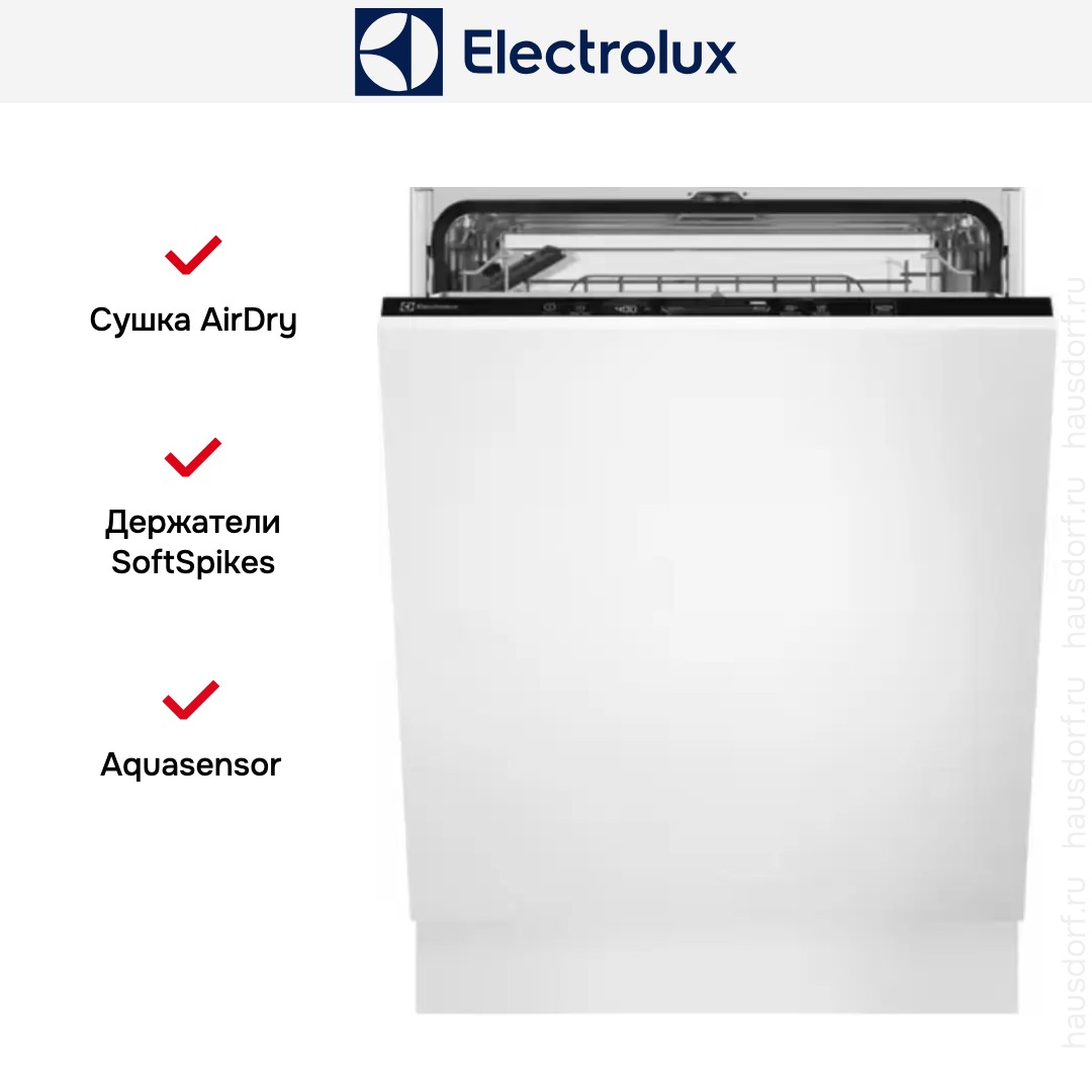 Встраиваемая модель Электролюкс отлично впишется в любой интерьер, главное — правильно выбрать место, чтобы подвести коммуникации. Устанавливается в нишу целиком, полностью закрывается декоративной панелью. Обратите внимание: в комплекте не идет фасад, его необходимо установить самостоятельно. Имеет стандартные размеры, поэтому может не поместиться на очень маленькой кухне. В камеру можно загрузить ограниченное число комплектов: 13 шт. Комплектом считается набор посуды на одного человека, который нужен для полноценного приема пищи: глубокая и плоская тарелки, тарелка для салата, блюдце под чашку, сама чашка, ложка и вилка.