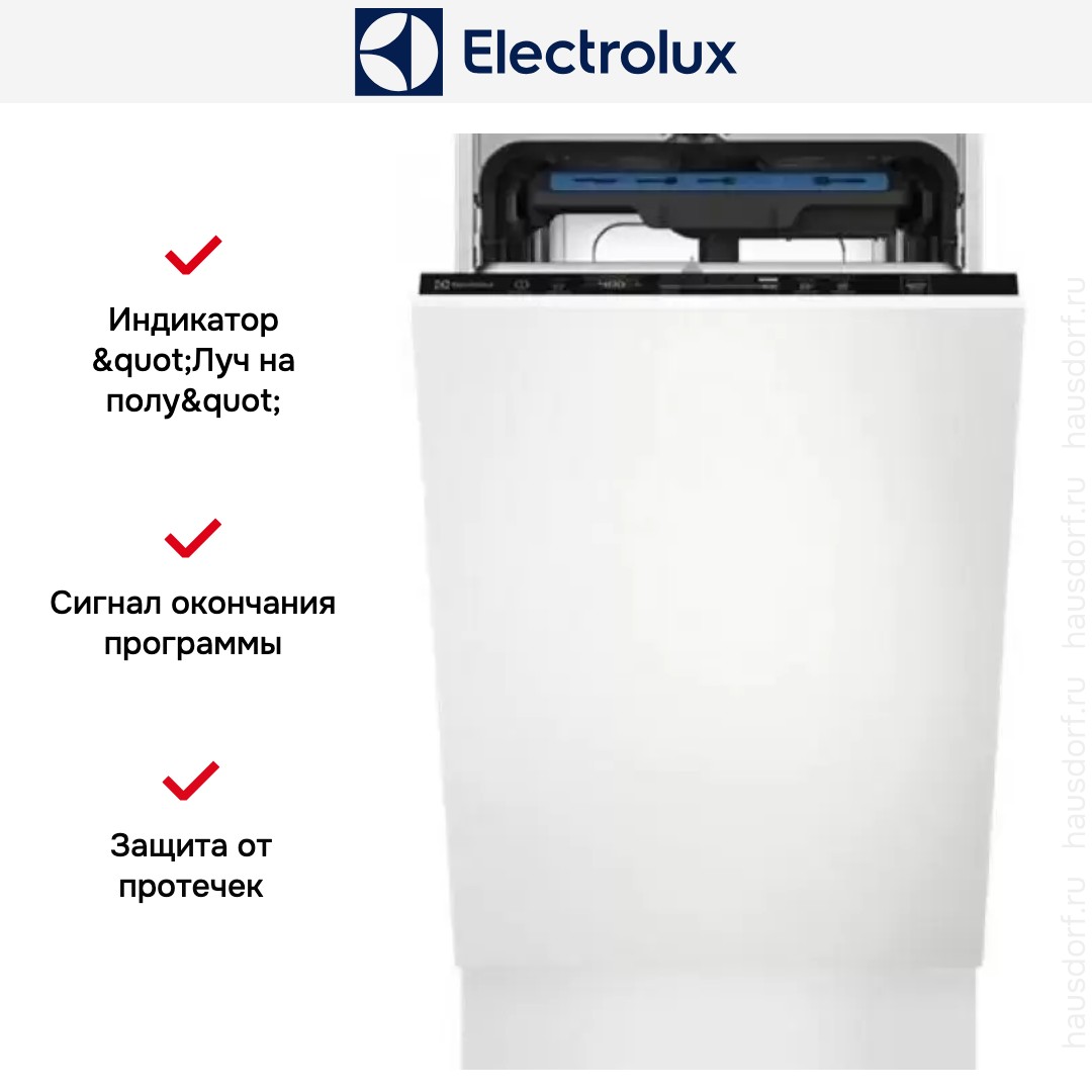 Встраиваемая модель Электролюкс отлично впишется в любой интерьер, главное — правильно выбрать место, чтобы подвести коммуникации. Устанавливается в нишу целиком, полностью закрывается декоративной панелью. Обратите внимание: в комплекте не идет фасад, его необходимо установить самостоятельно. Имеет уменьшенную ширину — благодаря этому поместится даже на очень маленькой кухне. В камеру можно загрузить ограниченное число комплектов: 10 шт. Комплектом считается набор посуды на одного человека, который нужен для полноценного приема пищи: глубокая и плоская тарелки, тарелка для салата, блюдце под чашку, сама чашка, ложка и вилка.