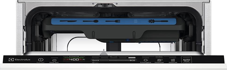 Встраиваемая модель Электролюкс отлично впишется в любой интерьер, главное — правильно выбрать место, чтобы подвести коммуникации. Устанавливается в нишу целиком, полностью закрывается декоративной панелью. Обратите внимание: в комплекте не идет фасад, его необходимо установить самостоятельно. Имеет уменьшенную ширину — благодаря этому поместится даже на очень маленькой кухне. В камеру можно загрузить ограниченное число комплектов: 10 шт. Комплектом считается набор посуды на одного человека, который нужен для полноценного приема пищи: глубокая и плоская тарелки, тарелка для салата, блюдце под чашку, сама чашка, ложка и вилка.