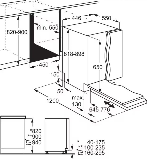 Большая часть полноразмерных и узких посудомоек встраиваемого и отдельностоящего вида имеет высоту около 82-85 см: такие модели легко размещаются под столешницей. Встраиваемые модели несколько ниже, так как у них отсутствует верхняя крышка.