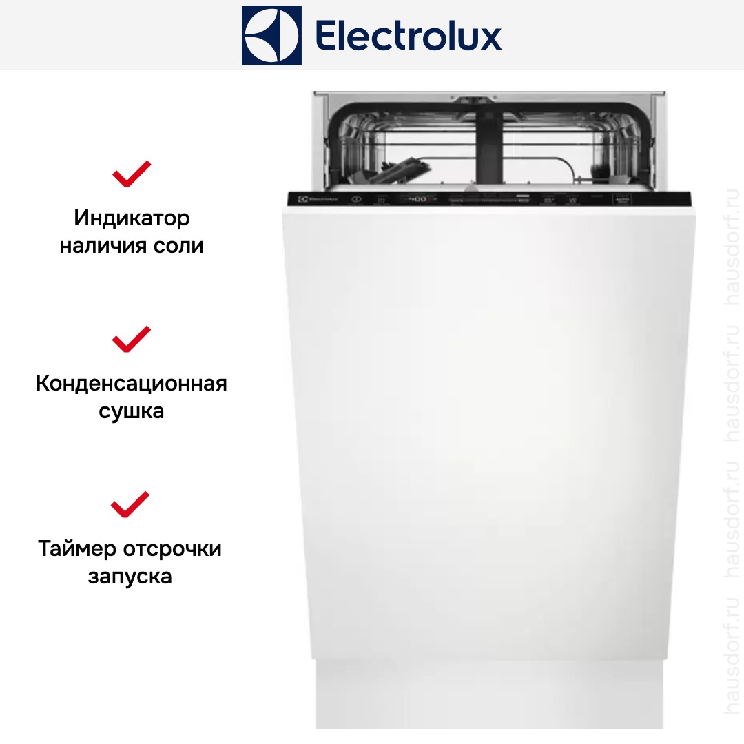 Встраиваемая посудомоечная машина Electrolux KESC2210L спроектирована для полного скрытого монтажа под фасад вашей кухни и сохраняет аккуратный и минималистичный внешний вид. Аппарат узкого формата легко помещается в нишу шириной 45 см и при высоте 81.8 см отлично вписывается в стандартную кухонную мебель. Черная закрытая панель управления остается невидимой при закрытой дверце, что делает фасад монолитным и стильным.