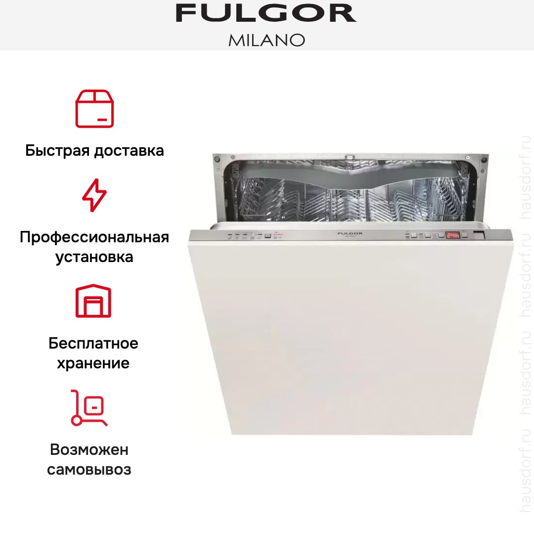 Встраиваемая модель Фулгор Милано отлично впишется в любой интерьер, главное — правильно выбрать место, чтобы подвести коммуникации. Устанавливается в нишу целиком, полностью закрывается декоративной панелью. Обратите внимание: в комплекте не идет фасад, его необходимо установить самостоятельно. Имеет стандартные размеры, поэтому может не поместиться на очень маленькой кухне. В камеру можно загрузить ограниченное число комплектов: 13 шт. Комплектом считается набор посуды на одного человека, который нужен для полноценного приема пищи: глубокая и плоская тарелки, тарелка для салата, блюдце под чашку, сама чашка, ложка и вилка.