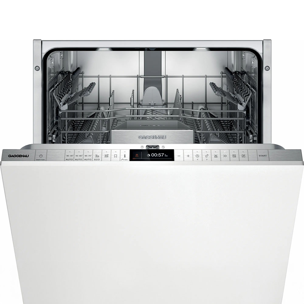 Встраиваемая модель Гаггенау отлично впишется в любой интерьер, главное — правильно выбрать место, чтобы подвести коммуникации. Устанавливается в нишу целиком, полностью закрывается декоративной панелью. Обратите внимание: в комплекте не идет фасад, его необходимо установить самостоятельно. Имеет стандартные размеры, поэтому может не поместиться на очень маленькой кухне. В камеру можно загрузить ограниченное число комплектов: 12 шт. Комплектом считается набор посуды на одного человека, который нужен для полноценного приема пищи: глубокая и плоская тарелки, тарелка для салата, блюдце под чашку, сама чашка, ложка и вилка.