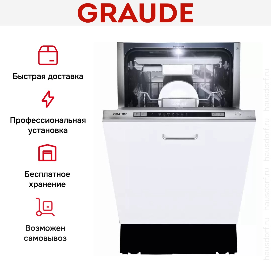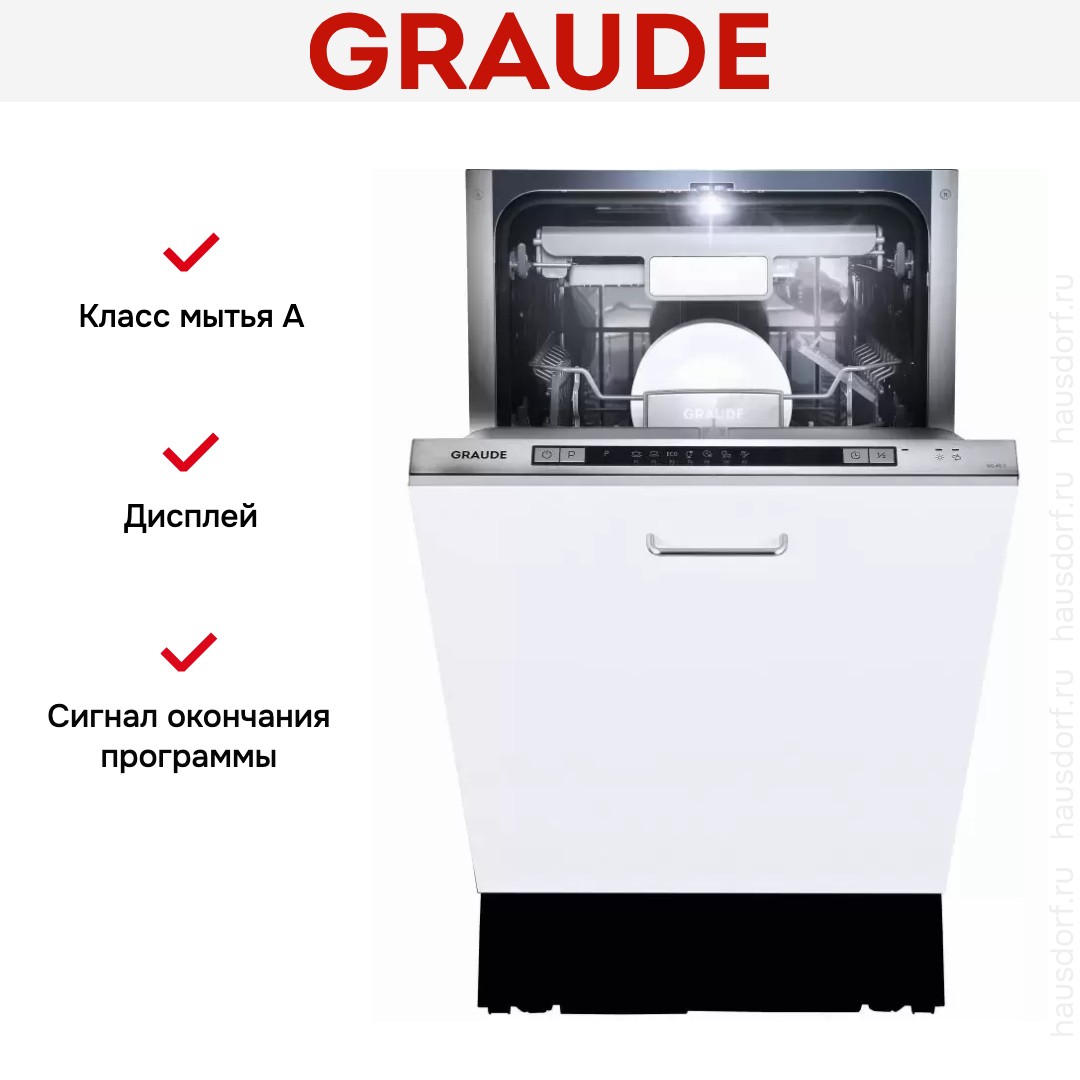 Graude VG 45.1 — узкая посудомоечная машина шириной 45 см. Рабочая камера модели рассчитана на одновременную загрузку до 10 комплектов посуды. Правильное размещение посуды на 3-х уровня повышает эффективность очищения поверхностей столовых приборов.