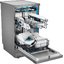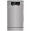 Это отдельно стоящая модель в корпусе серебристого цвета с черной панелью управления. Внутри — камера из нержавеющей стали, рассчитанная на 11 комплектов посуды. Одна из корзин регулируется по высоте, есть полочка для чашек и отдельная корзина для столовых приборов: удобно распределять утварь для лучшего мытья. Верхний распылитель равномерно подает воду по уровням, помогая отмыть посуду в труднодоступных местах.