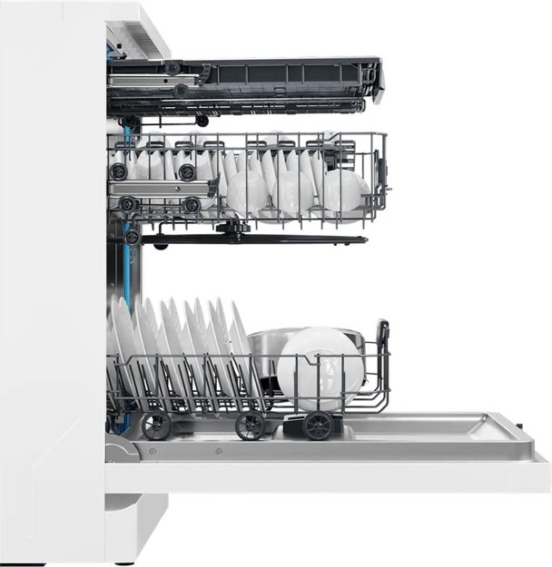 Полноразмерные модели выбирают в больших семьях, а также те, кто много готовит или часто принимает гостей. Их вместимость может составить до 15 комплектов посуды, а габаритные размеры соответствуют размерам стандартной кухонной мебели шириной и глубиной 60 см и высотой 82-85 см. Они выпускаются как во встраиваемом, так и в отдельностоящем варианте: во втором случае для установки понадобится достаточно много места. Как правило, полноразмерные приборы отличаются большим набором стандартных и специальных программ мойки, а также дополнительных опций: в частности, они оснащаются третьей корзиной для мытья столовых приборов.