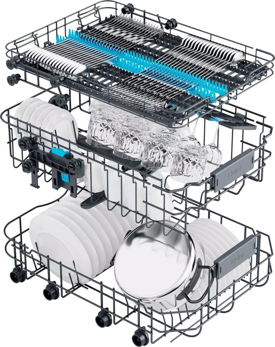 Встраиваемая модель Хайер отлично впишется в любой интерьер, главное — правильно выбрать место, чтобы подвести коммуникации. Устанавливается в нишу целиком, полностью закрывается декоративной панелью. Обратите внимание: в комплекте не идет фасад, его необходимо установить самостоятельно. Имеет уменьшенную ширину — благодаря этому поместится даже на очень маленькой кухне. В камеру можно загрузить ограниченное число комплектов: 11 шт. Комплектом считается набор посуды на одного человека, который нужен для полноценного приема пищи: глубокая и плоская тарелки, тарелка для салата, блюдце под чашку, сама чашка, ложка и вилка.