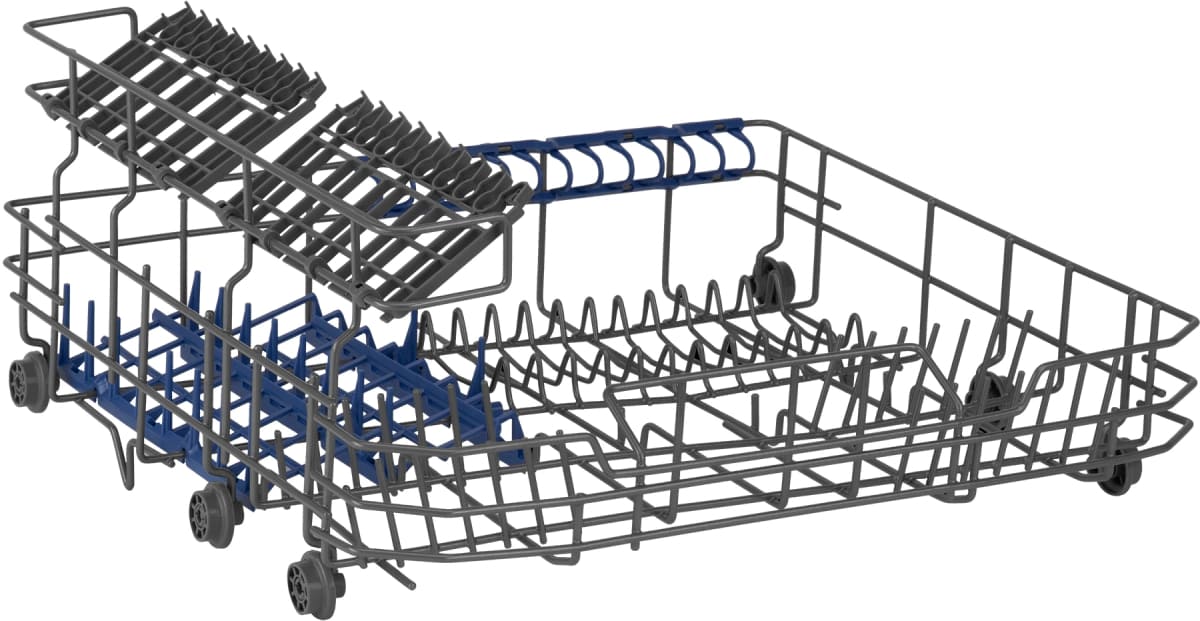 Верхняя корзина может регулироваться по высоте, так что при необходимости в нее можно поместить тарелки большего размера. Нижняя корзина позволяет установить вертикально большие суповые тарелки и блюда большого диаметра — для этого верхнюю корзину можно поднять выше. Тарелки обычно устанавливаются в откидные рамки-держатели, которые легко складываются на дно корзины. Всю посуду в нижней корзине рекомендуется устанавливать без соприкосновения предметов друг с другом, углублением к центру для более интенсивного воздействия струй воды на внутреннюю часть посуды.