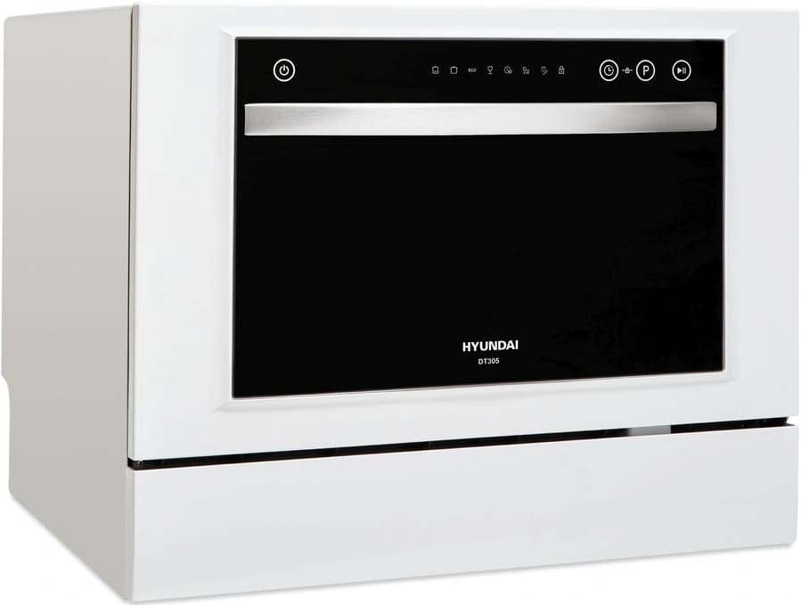 Отдельностоящая модель Хендай отлично впишется в кухонный интерьер, главное — правильно выбрать место, чтобы подвести коммуникации. Компактные размеры позволяют разместить ее даже на очень маленькой кухне. В камеру можно загрузить ограниченное число комплектов: 6 шт. Комплектом считается набор посуды на одного человека, который нужен для полноценного приема пищи: глубокая и плоская тарелки, тарелка для салата, блюдце под чашку, сама чашка, ложка и вилка.