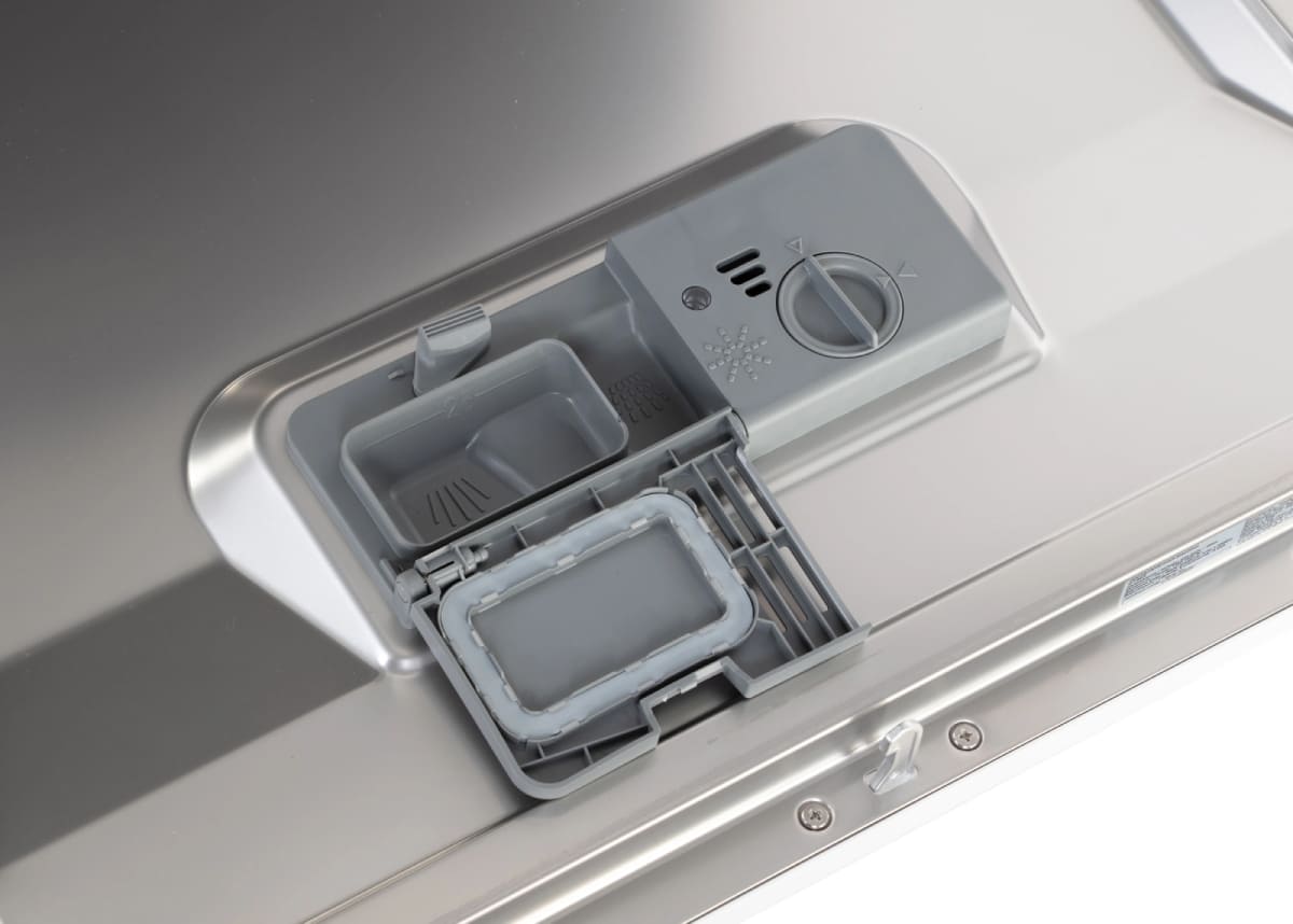 Чтобы смягчить водопроводную воду, в посудомоечных машинах устанавливается резервуар, куда загружается специальная соль. Перед первым использованием посудомойки необходимо выяснить уровень жесткости воды и отрегулировать систему смягчения. По умолчанию в машинах устанавливается средний уровень жесткости. Узнать уровень жесткости в той или иной местности можно при помощи специальных приборов или тест-полосок. Также эти сведения можно получить в соответствующей организации.