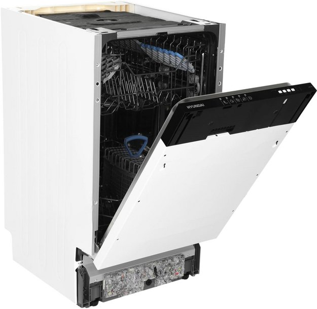 Встраиваемая модель Хендай отлично впишется в любой интерьер, главное — правильно выбрать место, чтобы подвести коммуникации. Устанавливается в нишу целиком, полностью закрывается декоративной панелью. Обратите внимание: в комплекте не идет фасад, его необходимо установить самостоятельно. Имеет уменьшенную ширину — благодаря этому поместится даже на очень маленькой кухне. В камеру можно загрузить ограниченное число комплектов: 10 шт. Комплектом считается набор посуды на одного человека, который нужен для полноценного приема пищи: глубокая и плоская тарелки, тарелка для салата, блюдце под чашку, сама чашка, ложка и вилка.