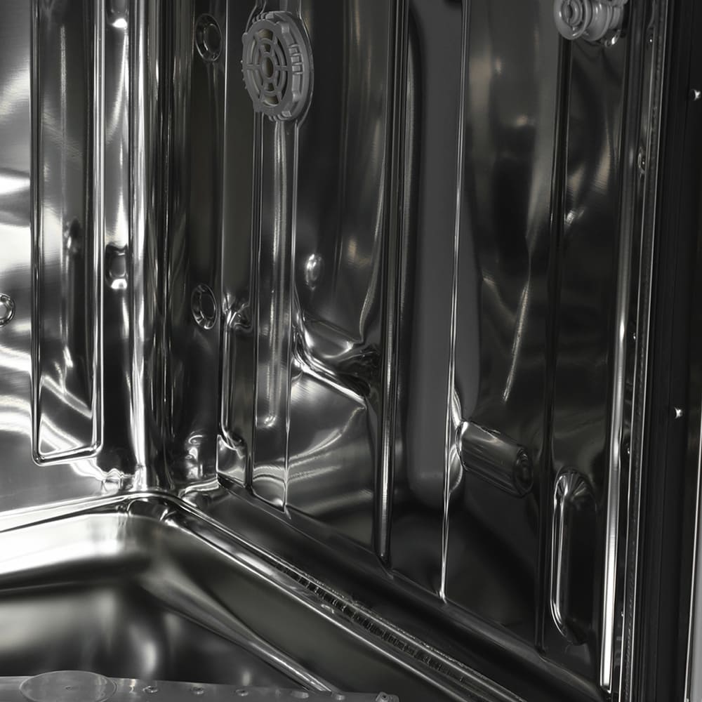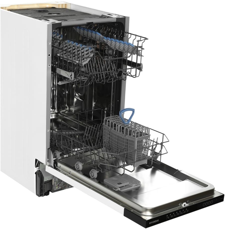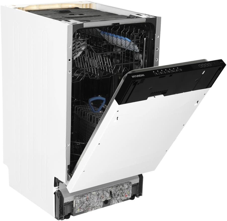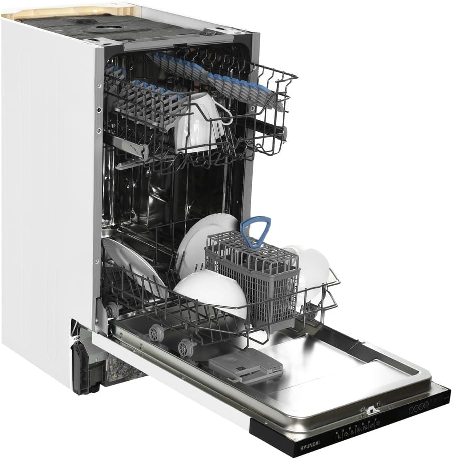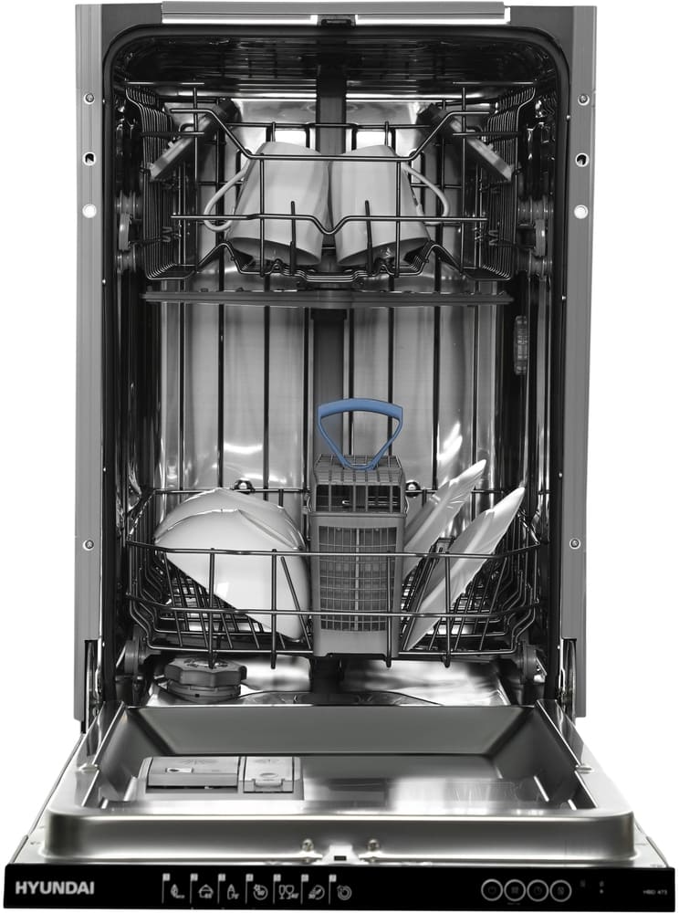 Встраиваемая модель Хендай отлично впишется в любой интерьер, главное — правильно выбрать место, чтобы подвести коммуникации. Устанавливается в нишу целиком, полностью закрывается декоративной панелью. Обратите внимание: в комплекте не идет фасад, его необходимо установить самостоятельно. Имеет уменьшенную ширину — благодаря этому поместится даже на очень маленькой кухне. В камеру можно загрузить ограниченное число комплектов: 10 шт. Комплектом считается набор посуды на одного человека, который нужен для полноценного приема пищи: глубокая и плоская тарелки, тарелка для салата, блюдце под чашку, сама чашка, ложка и вилка.