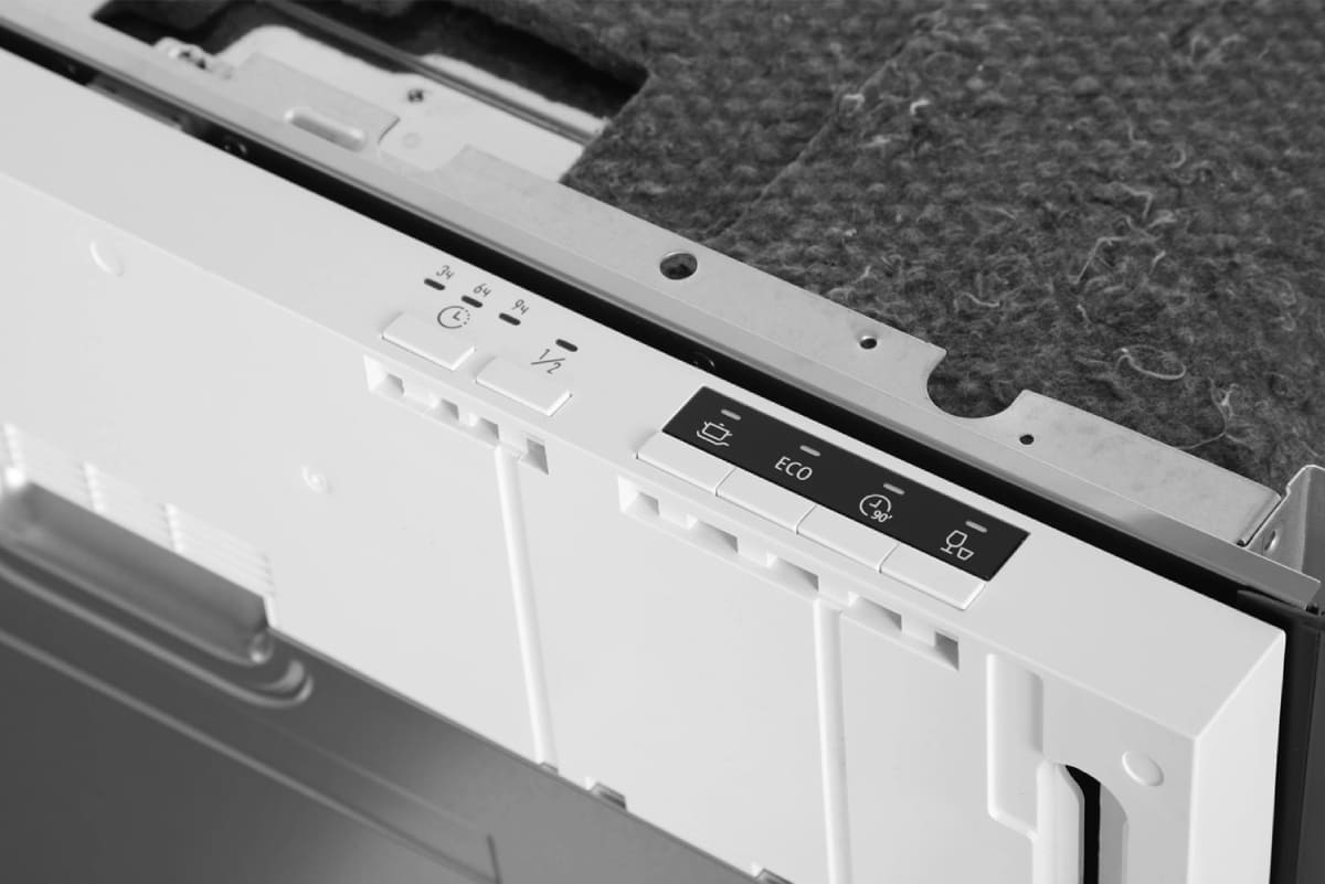 Кнопки на панели управления посудомоечных машин позволяют быстро выбирать одну из стандартных программ мытья, задавать дополнительные опции. Расположение панели управления обычно определяется типом посудомоечной машины. У встраиваемых моделей кнопки, дисплей и индикаторы располагаются на торце дверцы, поскольку в передней части навешивается декоративный мебельный фасад. Отдельностоящие машины могут оснащаться панелью управления, расположенной расположена на фасадной части.