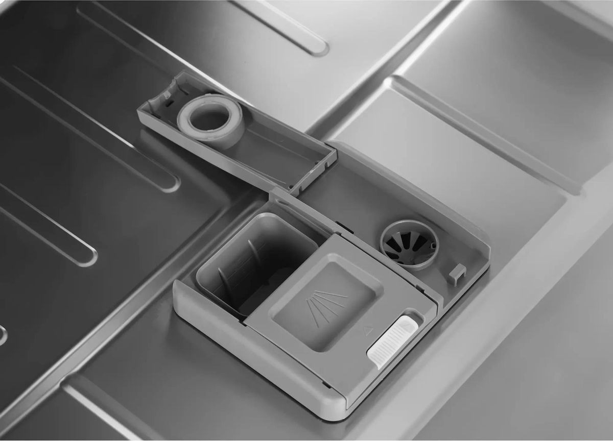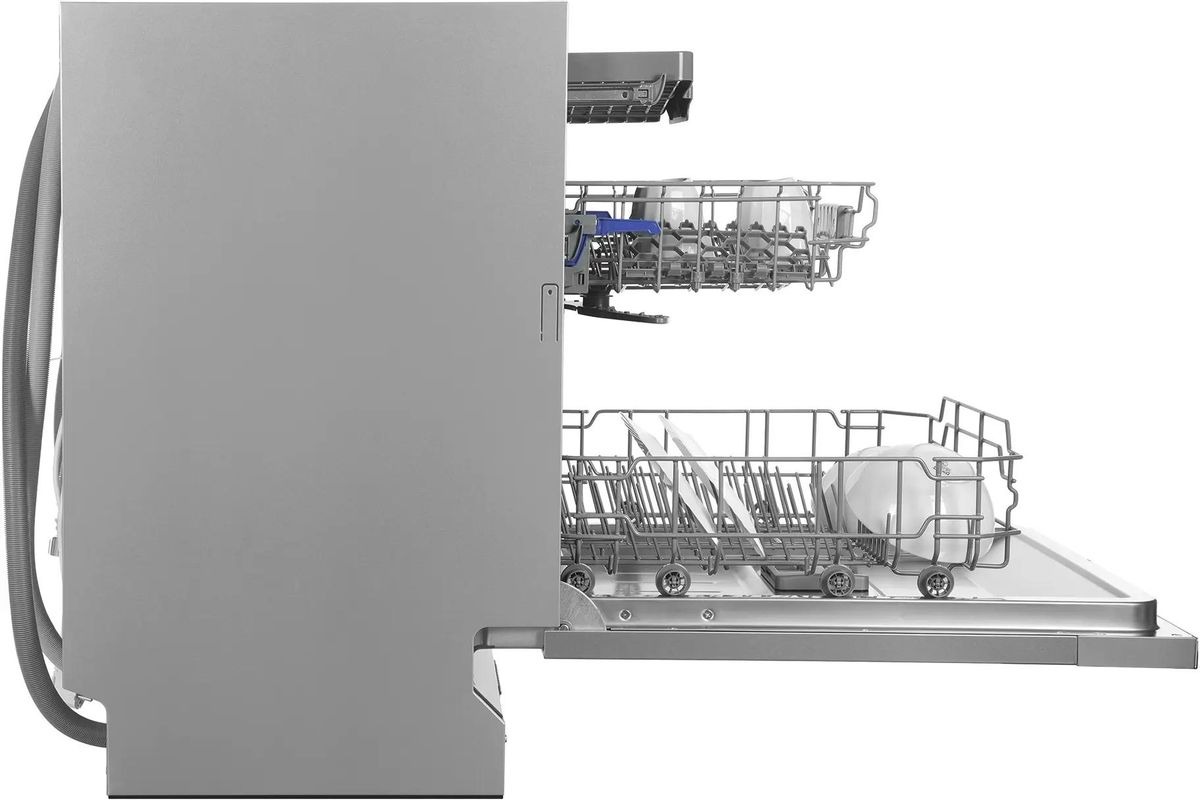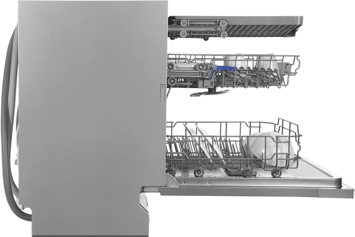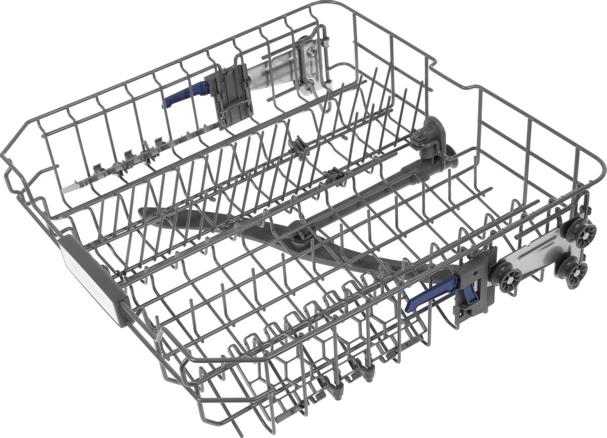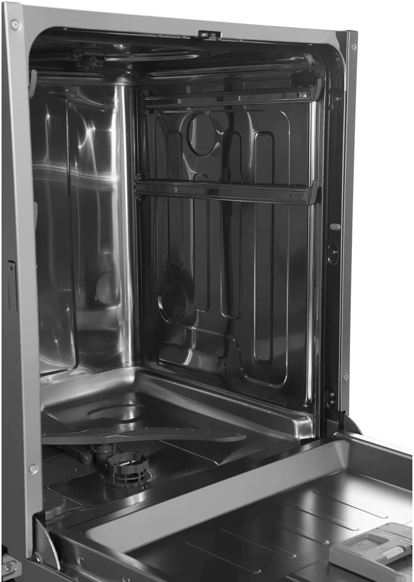 Внутренняя компоновка рассчитана на 14 комплектов посуды, что делает машину удобной для семьи из нескольких человек и для тех, кто любит принимать гостей. Корзины и полки выполнены из прочных материалов с коррозионно-устойчивым покрытием, они рассчитаны на длительную эксплуатацию в условиях высокой влажности. Верхняя корзина регулируется по высоте, что позволяет разместить высокие бокалы или крупную посуду во второй корзине. Специальная полка для столовых приборов освобождает место в основной корзине и улучшает качество мытья столовых предметов.