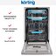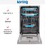 Встраиваемая посудомоечная машина Korting KDI 45977 представляет собой элегантное узкое решение для компактных кухонь, которое гармонично прячется под фасадом и одновременно предлагает продуманный набор функций для тщательной и экономичной заботы о посуде. Корпус высотой 81,5 см и шириной 44,8 см рассчитан на нишу 82—88×45×55 см, что делает модель идеальной для встроенной установки с полностью скрытой передней панелью; при открытой дверце прибор занимает 115 см в глубину, а сама конструкция весит 32,57 кг, обеспечивая надежность и устойчивость благодаря регулируемым ножкам. Внутреннее пространство рассчитано на 10 комплектов, оснащено регулируемой по высоте корзиной, направляющими для тарелок в обоих ярусах, полкой для столовых приборов и полочкой для чашек на верхнем уровне; дополнительный фиксатор и специальные направляющие для бокалов сохраняют деликатную посуду в целости. Технология S-Form распылителей и верхний распылитель обеспечивают равномерное покрытие водой, а опция мойки в любой корзине делает загрузку гибкой. Управление выполнено электронным способом с закрытой серебристой панелью, цифровым дисплеем и сенсорными элементами Touch Control: доступны кнопки включения и выбора режима, таймер отсрочки от 1 до 24 часов и индикаторы наличия соли и ополаскивателя; в конце цикла прибор информирует световой индикацией и проектирует «луч на полу» для удобства. Встроенная внутренняя подсветка упрощает размещение посуды в темное время суток. Машина предлагает восемь базовых режимов, включая ночной стандарт, программу «Эко» 50°C (эталонный цикл длится 208 минут), интенсивную мойку, щадящую для деликатных предметов, режим для слабо загрязнённой посуды, предварительное полоскание, опцию быстрого цикла и половинную загрузку; присутствует гигиеническая программа для стерилизации. Активная сушка с функцией экстра-сушки и режим Турбо+ ускоряют окончание процесса и улучшают результат, а использование средств 3 в 1 делает эксплуатацию простой и удобной. Инверторный мотор и проточный водонагреватель обеспечивают экономичное и тихое функционирование при уровне шума 42 дБ, энергопотребление на цикл составляет 0,593 кВт·ч, годовой расход электроэнергии около 170 кВт·ч, а потребление воды и вовсе невелико — 8 литров за цикл и порядка 2240 литров в год; классы эффективности A+++ по энергии, A по мытью и A по сушке подтверждают высокие показатели. Для дополнительной безопасности предусмотрены система AquaControl против протечек и автоматическое отключение, фильтрация воды, а комплект поставки включает тестер жесткости, заливной и сливной шланги, воронку для засыпки соли, мерную ложку и стакан. Встроенная конструкция с закрытым управляющим модулем и серебристой панелью управления позволяет интегрировать прибор под любой фасад, сохраняя аккуратный вид кухни и обеспечивая одновременно мощный набор функций для ежедневного использования.
