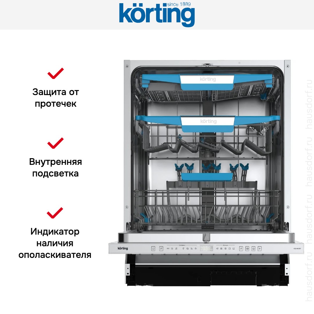 Korting KDI 60557 компактно вписывается в интерьер благодаря продуманной встраиваемой конструкции: полностью встраиваемый корпус стандартной полноразмерной высоты 81.5 см аккуратно займёт нишу 82—88×60×55 см, а габариты 81.5×59.8×55 см уделяют внимание эргономике и рациональному использованию пространства. Внешняя панель управления серебристого цвета скрыта за фасадом, что позволяет гармонировать с кухонными модификациями и оставляет место для индивидуального оформления под ваш навесной фронт, а закрытый электронный блок с цифровым дисплеем обеспечивает интуитивное управление и комфорт при выборе опций. Модель сочетает высокий уровень комфорта и экономичности: вместимость до 14 комплектов, семь стандартных программ включают гигиеничную, автоматические циклы, интенсивную мойку, режим для немного загрязнённой посуды, половинную загрузку, быструю и деликатную программы, а также предварительное полоскание — всё это позволяет адаптировать цикл под нужды семьи и тип посуды. Функциональность дополняется активной сушкой с опцией «Экстра-сушка», поддержкой средств 3 в 1 и проточным нагревателем, что ускоряет прогрев воды и повышает эффективность удаления загрязнений. Технологическое наполнение включает S-Form разбрызгиватели, верхний распылитель, направляющие для тарелок в обоих коробах, полочку для чашек в верхнем уровне и практичную полку для столовых приборов — все элементы созданы для удобного размещения и качественного мытья. Корзины регулируются по высоте, предусмотрена мойка в любой полке, а дополнительный фиксатор для бокалов бережно защищает хрупкую посуду. Для контроля состояния прибор оснащён индикаторами наличия ополаскивателя и соли, индикацией отсутствия подачи воды, световым сигналом завершения и популярной функцией «луч на полу», а внутреннее освещение упрощает загрузку при недостаточном свете. Экономичные режимы, включая Eco, снижают потребление ресурсов: расход воды на цикл 10 л и годовой показатель 2800 л сочетаются с энергоэффективностью класса A++ и энергопотреблением 0.951 кВт·ч за цикл (270 кВт·ч/год). Производительность подтверждается классами мытья и сушки A и уровнем шума 47 дБ, что обеспечивает тихую работу без дискомфорта. Таймер отсрочки запуска от 1 до 24 часов, функция «Экономия времени» и опция быстрой стирки дают гибкость планирования, а наличие тестера жёсткости, заливного и сливного шлангов (1.6 и 1.4 м), фильтра и поддержка использования трёхв-1 средств делают эксплуатацию простой и надёжной. Безопасность обеспечивают система AquaControl и автоматическое отключение, регулируемые ножки позволяют точно выставить прибор по уровню, а прочная конструкция и небольшой вес в 38 кг (брутто 40.34 кг) упрощают монтаж и обслуживание. Этот аппарат адресован тем, кто ценит сочетание стильного минимализма и продуманных инженерных решений: посудомоечная машина Korting предлагает гибкий набор программ, бережную обработку хрупких вещей и эффективное удаление загрязнений при экономном расходе воды и электроэнергии, что делает её удачным выбором для современных кухонь.