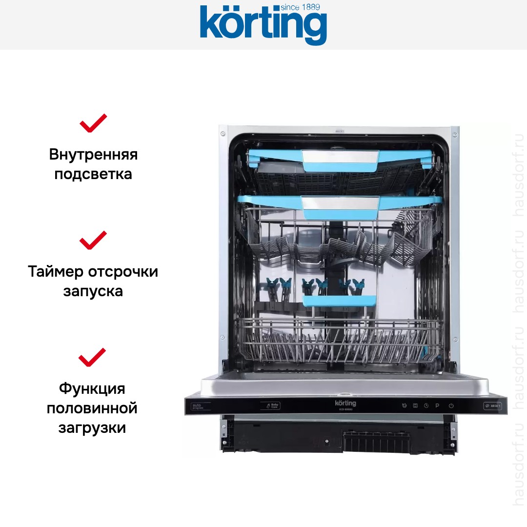 На торце дверцы посудомойки Кортинг KDI 60980 находится электронная панель управления Touch Control с дисплеем и таймером. Запуск можно отложить при помощи функции отсрочки старта — максимальное время отсрочки составляет 24 часа, При закрытой дверце за выполнением программы можно следить благодаря индикатору «Луч на полу». Три разбрызгивателя, в том числе S-Form и Spiral Wash, гарантируют отличное качество мытья.