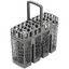 Корзина для столовых приборов — один из обязательных аксессуаров, которыми оснащается любая посудомоечная машина. Она представляет собой сетчатый пластиковый органайзер, в котором устанавливаются в вертикальном положении ложки, ножи и вилки. Корзина, как правило, разделяется на отдельные отсеки, в каждый из которых можно поместить один или несколько предметов. Зачастую сверху она закрывается специальной крышкой, которая также служит для разделения приборов, способствуя более тщательному их мытью.