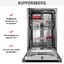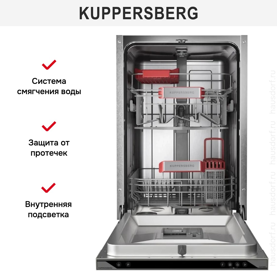 Kuppersberg GLM 4582 — встроенная полностью интегрируемая посудомоечная машина, созданная для компактных кухонь, где важны экономия пространства и привычный уровень сервиса: узкий корпус шириной 44.8 см и высотой 81.5 см при глубине 55 см идеально вписывается в нишу 82×45×58 см, а при открытой двери требует 115 см свободного пространства. Внешняя часть рассчитана под оформление фасада, панель управления скрыта за облицовкой и выполнена в черном цвете с цифровым дисплеем и удобными кнопками Вкл./Выкл. и выбора программы; электроника обеспечивает точный выбор режимов и отсрочку запуска от 1 до 24 часов. Внутреннее пространство продумано до мелочей: два уровня хранения с регулируемой по высоте корзиной, полочка для чашек в верхнем блоке, направляющие для тарелок в обоих коробах и отдельная корзина для столовых приборов — система «мойка в любой корзине» позволяет гибко распределять загрузку на 10 комплектов посуды. Технологическая часть включает семь температурных режимов и столько же стандартных программ, среди которых ночной цикл и эталонный режим Eco 50°C с продолжительностью 198 минут; в арсенале также имеются гигиеническая программа, автоматические установки, интенсивная мойка, быстрая и деликатная программы. Сушка выполняется конденсационным способом, что бережно относится к деликатным предметам, а класс сушки и мытья — «A», при этом энергопотребление отмечено как A+++ и составляет 0.674 кВт·ч за цикл при максимальной мощности 2100 Вт; расход воды на цикл — всего 8.5 л, годовой объем — 2380 л, уровень шума — 47 дБ. Практические опции включают функцию экономии времени, режим самоочистки, эко-настройку, автоматическое открытие дверцы в конце цикла для улучшения сушки, систему смягчения воды и поддержку средств 3 в 1; дополнительно доступен дополнительный разбрызгиватель Plus Wash, настройка дозировки ополаскивателя и расхода соли, съемные разбрызгиватели и фильтр. Безопасность обеспечена полной защитой от протечек и автоматическим отключением, есть индикаторы наличия ополаскивателя и соли, сигнальная подсветка окончания программы и инновационный индикатор «луч на полу» для удобства пользователя. Комплект поставки включает воронку для засыпания соли, монтажный комплект, сливной и заливной шланги, а длина сетевого шнура — 1.5 м; конструкция предусматривает плавное закрытие и открытие дверцы, слайдерное крепление фасада и регулируемые ножки для точной установки. Вес агрегата составляет 32.3 кг (брутто 37 кг), питание 220-240 В и частота 50 Гц. Этот компактный встроенный прибор сочетает в себе продуманный дизайн, эргономику и расширенный набор возможностей, подходящий для семей, желающих экономично расходовать ресурсы и получать чистую, сухую посуду с минимальными усилиями и исчерпывающим набором режимов для любых задач.