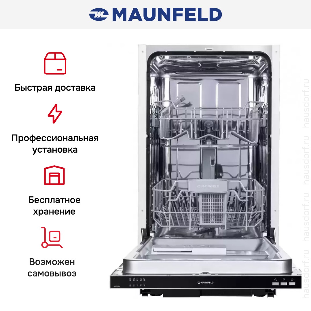В базовую комплектацию посудомоечной машины входят сливной и заливной шланг, воронка для соли и держатель для шланга. Отдельно можно приобрести дополнительные аксессуары — подставку для столовых приборов, держатель для стаканов и т.д. Машинка MAUNFELD MLP08I является довольно узкой по сравнению с аналогами, ее ширина составляет всего лишь 44,8 см, что позволяет расположить ее в сравнительно небольшой нише.