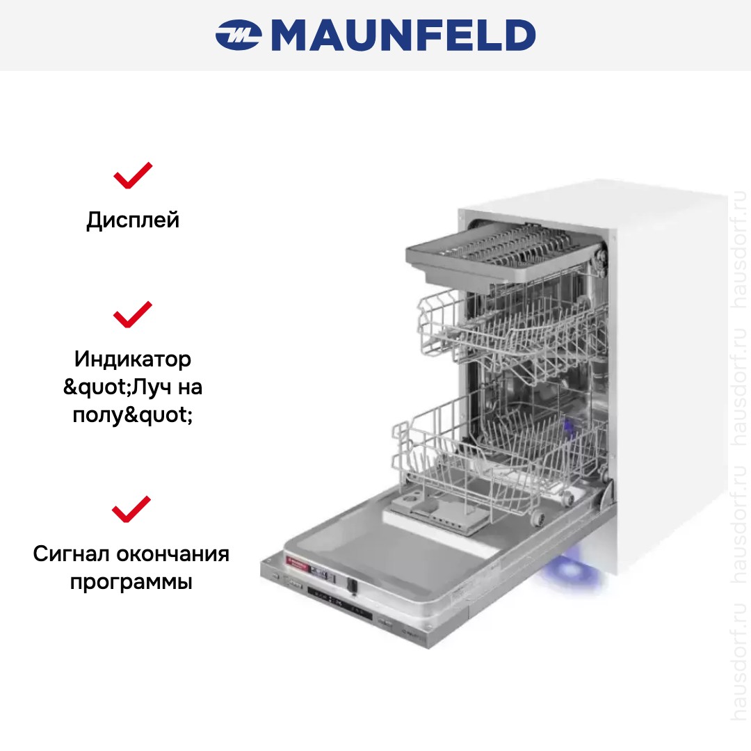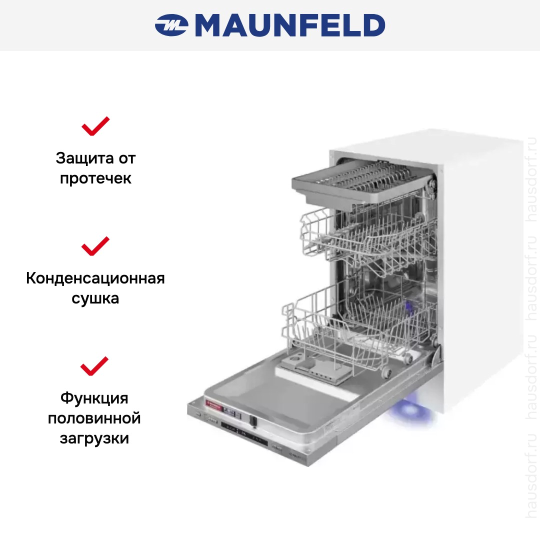 Посудомоечная машина Maunfeld MLP45130 Light Beam — встраиваемая узкая модель, созданная для небольших кухонь и современных интерьеров. Ее габариты 81.5×44.8×55 см и вместимость до 9 комплектов посуды делают прибор оптимальным решением для семьи из двух-трех человек или для использования в офисе.