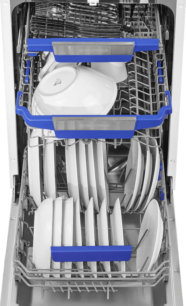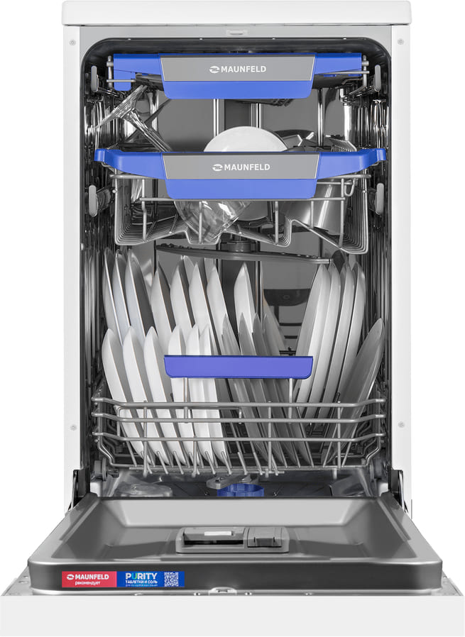 Отдельностоящая модель Маунфилд отлично впишется в кухонный интерьер, главное — правильно выбрать место, чтобы подвести коммуникации. Имеет уменьшенную ширину — благодаря этому поместится даже на очень маленькой кухне. В камеру можно загрузить ограниченное число комплектов: 10 шт. Комплектом считается набор посуды на одного человека, который нужен для полноценного приема пищи: глубокая и плоская тарелки, тарелка для салата, блюдце под чашку, сама чашка, ложка и вилка.
