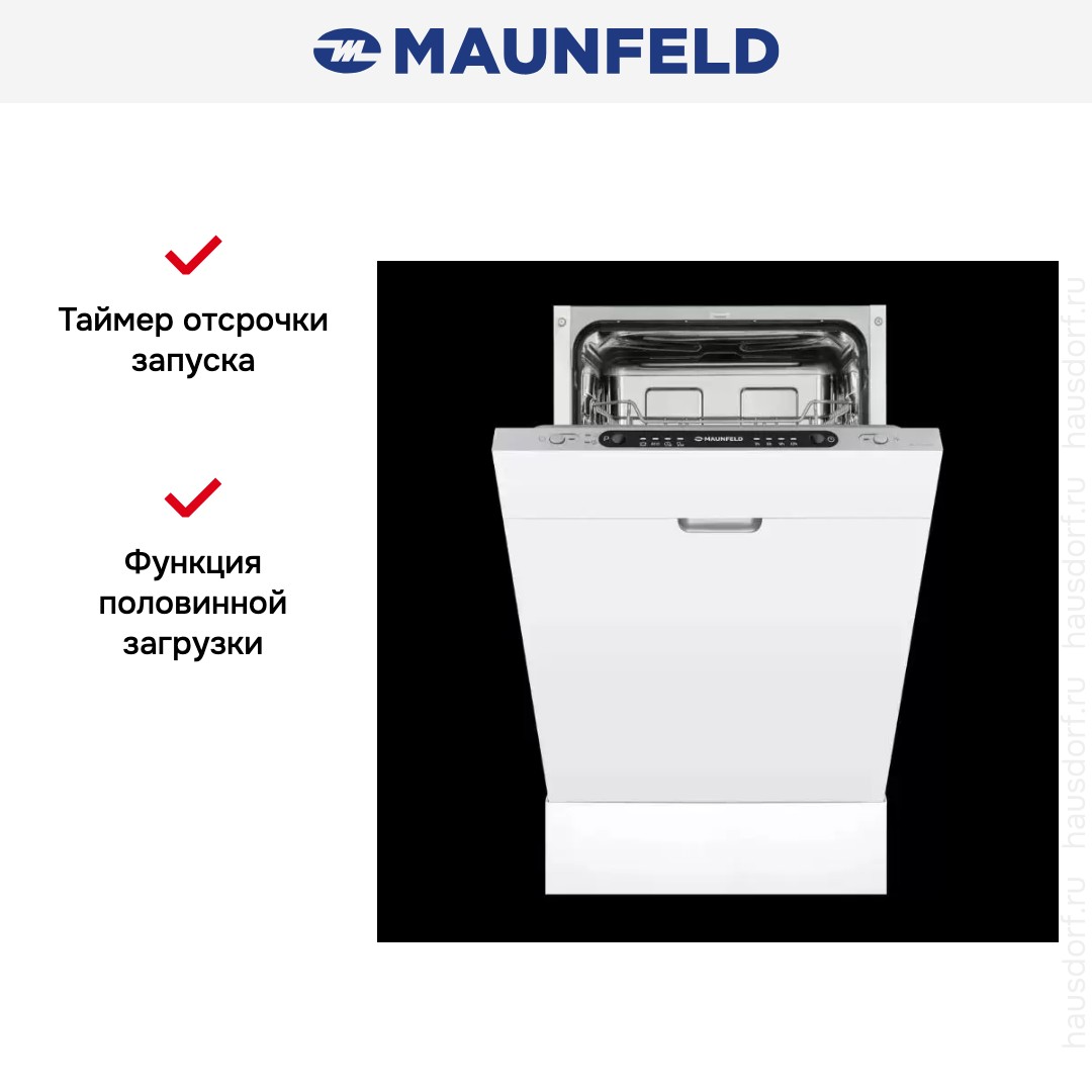 Встраиваемая модель Маунфилд отлично впишется в любой интерьер, главное — правильно выбрать место, чтобы подвести коммуникации. Устанавливается в нишу целиком, полностью закрывается декоративной панелью. Обратите внимание: в комплекте не идет фасад, его необходимо установить самостоятельно. Имеет уменьшенную ширину — благодаря этому поместится даже на очень маленькой кухне. В камеру можно загрузить ограниченное число комплектов: 9 шт. Комплектом считается набор посуды на одного человека, который нужен для полноценного приема пищи: глубокая и плоская тарелки, тарелка для салата, блюдце под чашку, сама чашка, ложка и вилка.