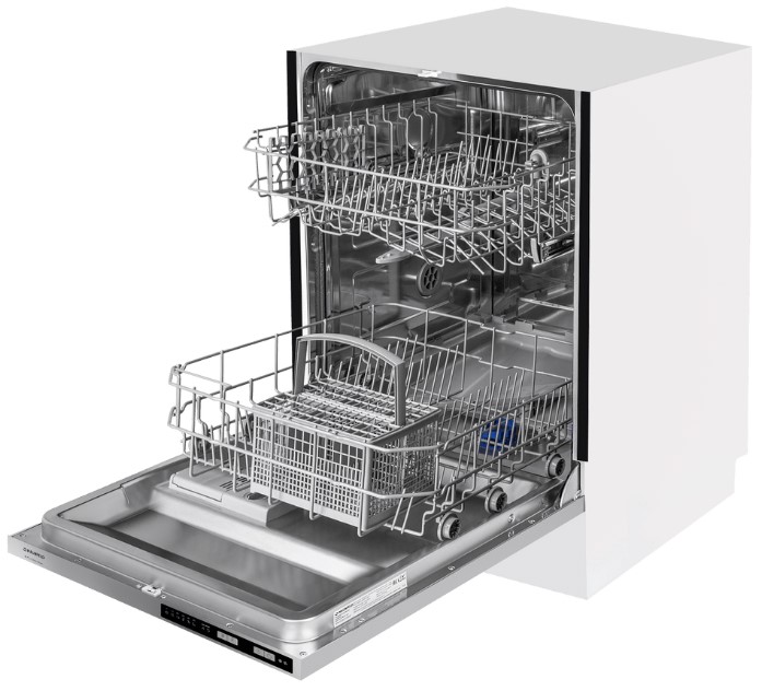 Полноразмерные модели выбирают в больших семьях, а также те, кто много готовит или часто принимает гостей. Их вместимость может составить до 15 комплектов посуды, а габаритные размеры соответствуют размерам стандартной кухонной мебели шириной и глубиной 60 см и высотой 82-85 см. Они выпускаются как во встраиваемом, так и в отдельностоящем варианте: во втором случае для установки понадобится достаточно много места. Как правило, полноразмерные приборы отличаются большим набором стандартных и специальных программ мойки, а также дополнительных опций: в частности, они оснащаются третьей корзиной для мытья столовых приборов.