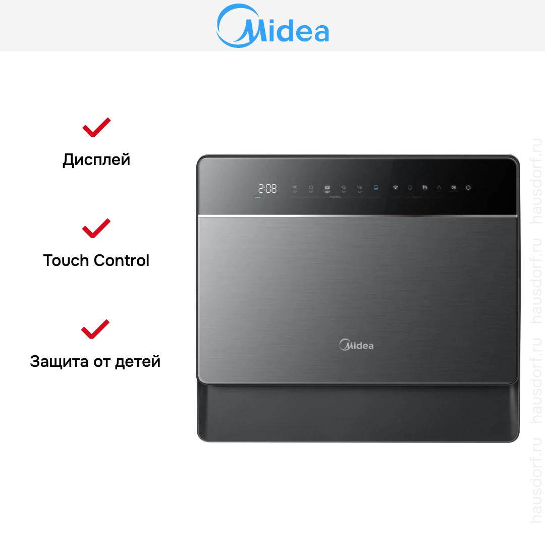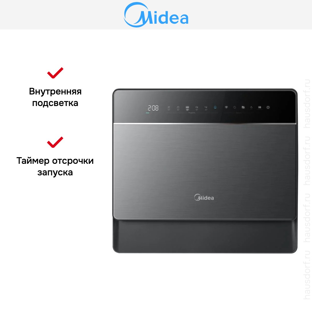 Посудомоечная машина Midea MCFD55S550BI — компактный и продуманный прибор для тех, кто ценит аккуратность и экономию места. Она выполнена в серебристом корпусе с контрастной чёрной панелью управления, что придаёт устройству современный внешний вид. Габариты 50×55×34,5 см позволяют установить агрегат в небольших кухнях или на даче без дополнительной встроенной мебели. Открытая панель с сенсорными кнопками и дисплеем смотрится минималистично и делает управление визуально понятным. Внутренняя подсветка облегчает загрузку посуды в тёмное время суток и повышает удобство эксплуатации.