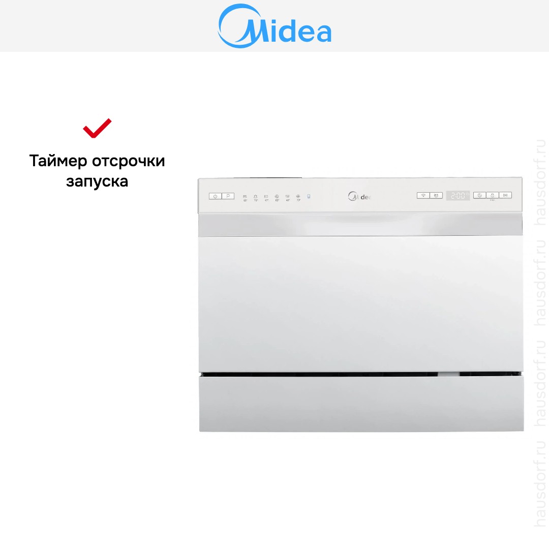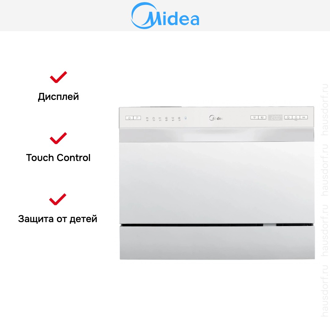Компактная посудомоечная машина Midea MCFD55S450WI. Элегантный белый корпус и белая панель управления впишутся в современный интерьер и визуально расширят рабочую зону. Небольшие габариты 43.8×55×50 см делают прибор удобным для установки на столешницу или в нишу малой кухни. Отдельностоящая конструкция упрощает монтаж и перемещение при уборке или ремонте. Вес около 20 кг обеспечивает устойчивость и при этом позволяет перемещать устройство при необходимости.