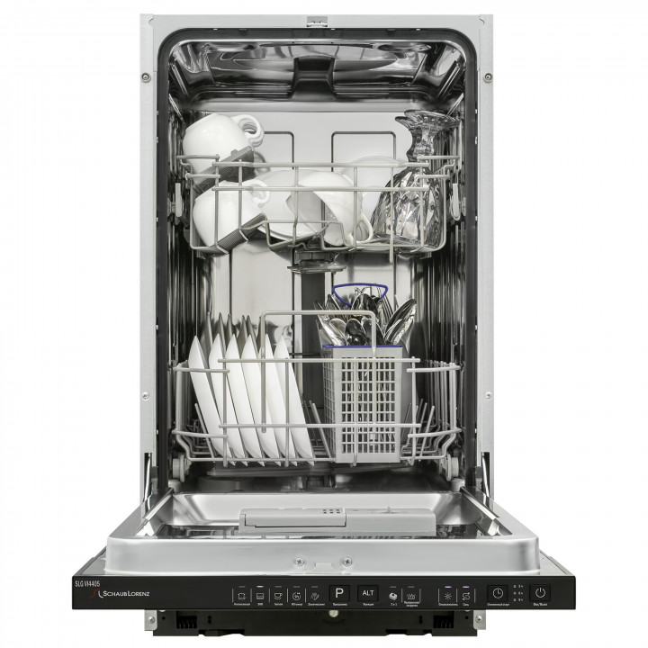 Встраиваемая модель Шауб Лоренц отлично впишется в любой интерьер, главное — правильно выбрать место, чтобы подвести коммуникации. Устанавливается в нишу целиком, полностью закрывается декоративной панелью. Имеет стандартные размеры, поэтому может не поместиться на очень маленькой кухне. В камеру можно загрузить ограниченное число комплектов: 9 шт. Комплектом считается набор посуды на одного человека, который нужен для полноценного приема пищи: глубокая и плоская тарелки, тарелка для салата, блюдце под чашку, сама чашка, ложка и вилка.