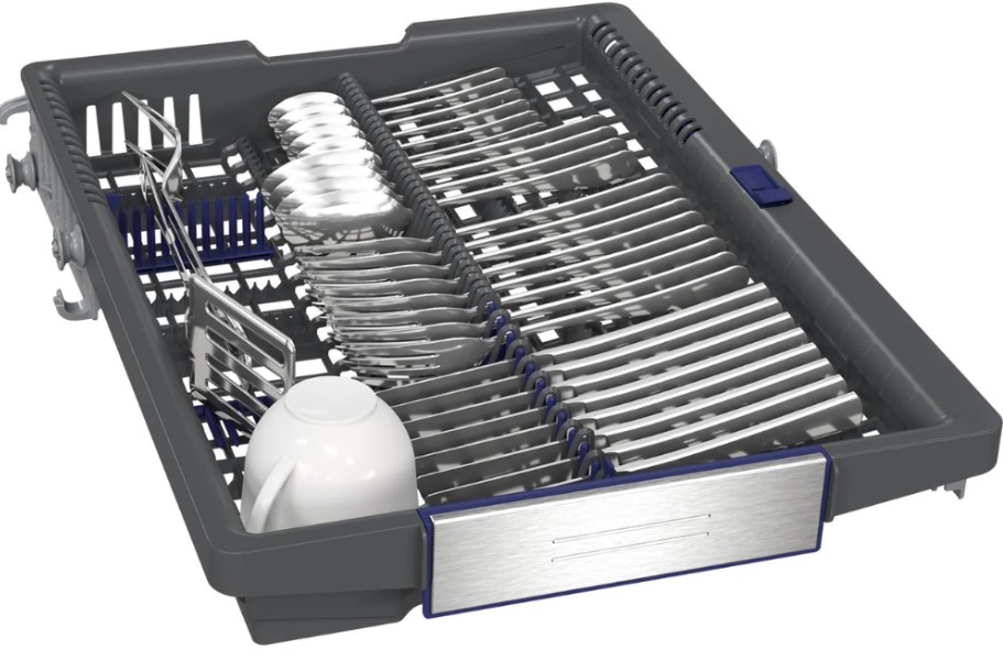 Корзина для столовых приборов — один из обязательных аксессуаров, которыми оснащается любая посудомоечная машина. Она представляет собой сетчатый пластиковый органайзер, в котором устанавливаются в вертикальном положении ложки, ножи и вилки. Корзина, как правило, разделяется на отдельные отсеки, в каждый из которых можно поместить один или несколько предметов. Зачастую сверху она закрывается специальной крышкой, которая также служит для разделения приборов, способствуя более тщательному их мытью.